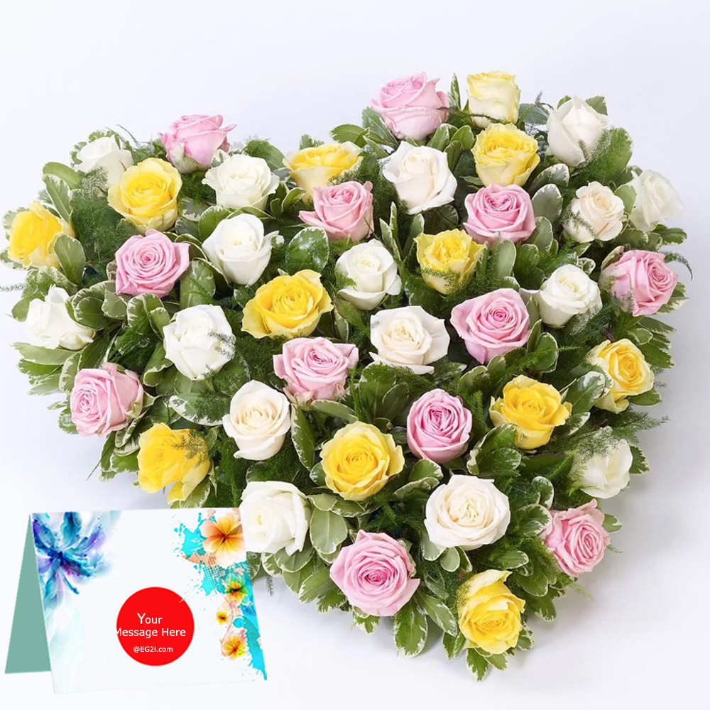 100 Pink Yellow and White Roses Heart Shape Arrangmnet