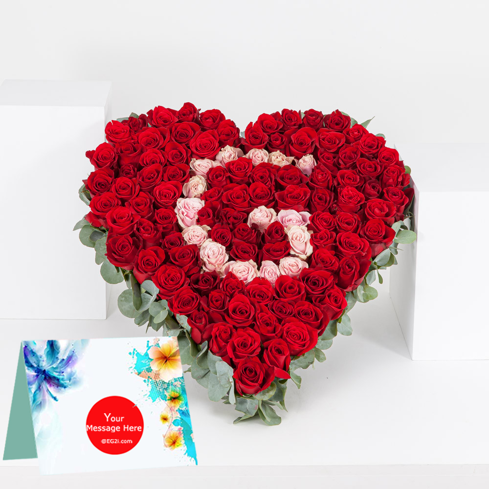 100 Red Rose Heart Shape Arrangement with 16 Pink Roses for Single Letter