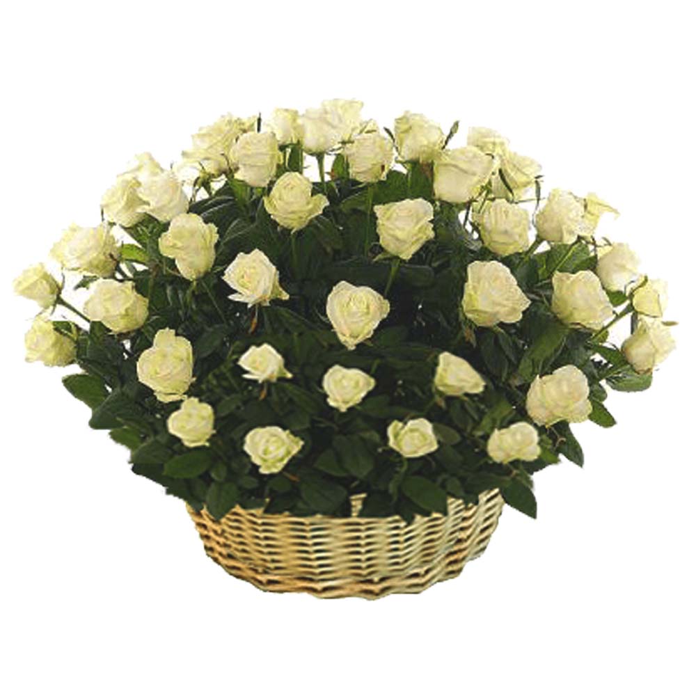 100 White Roses with Greenery in A Round Basket Arrangement.