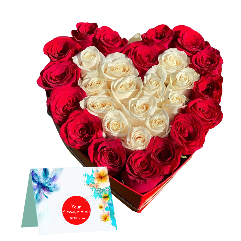 Heart Shape Basket of 17 Red Roses and 13 White Roses.