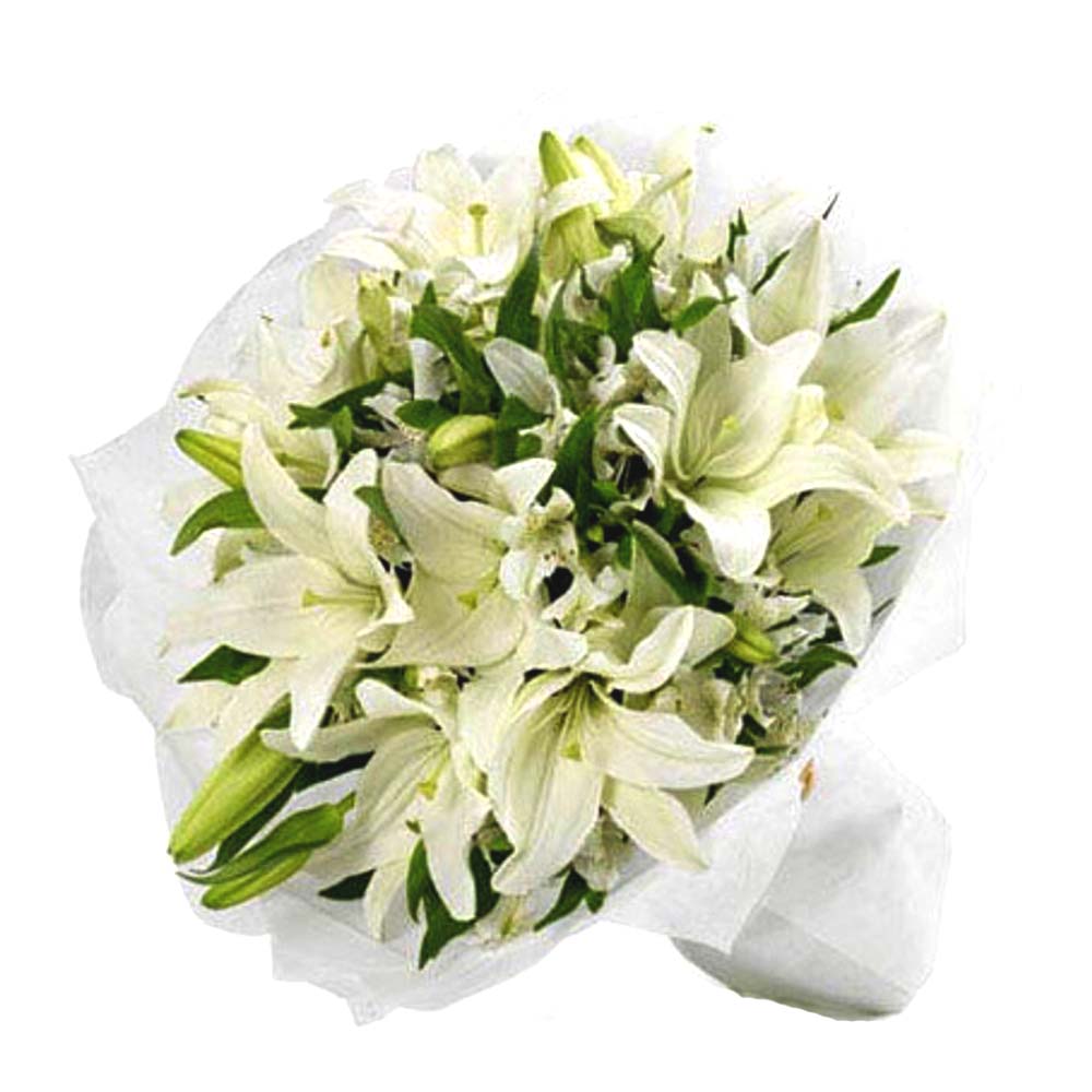 20 Steam White Oriental Lilies with Greenery and White Paper Wrapping White Ribbon Bow.