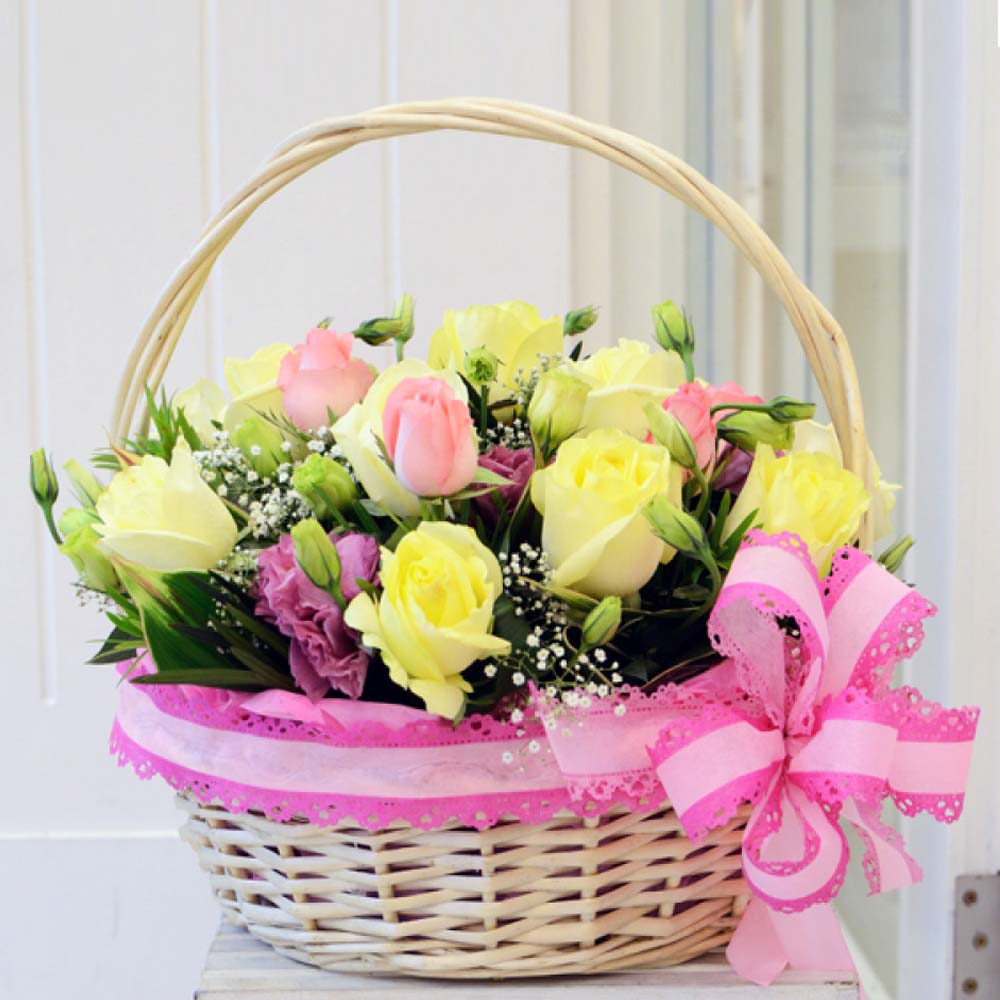 20 stick Yellow and Pink Roses, 5 Pink carnation Round Handle basket (Basket depend on local availability).
