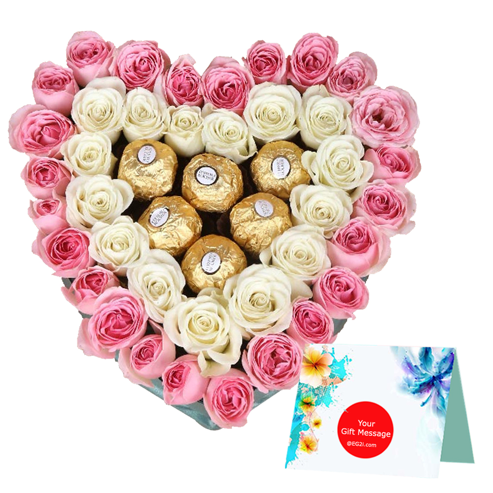 Heart Shape Basket Arrangement of 25 Pink Roses, 15 White Roses with 4 Pcs Ferrero Rocher In Middle Of Basket.