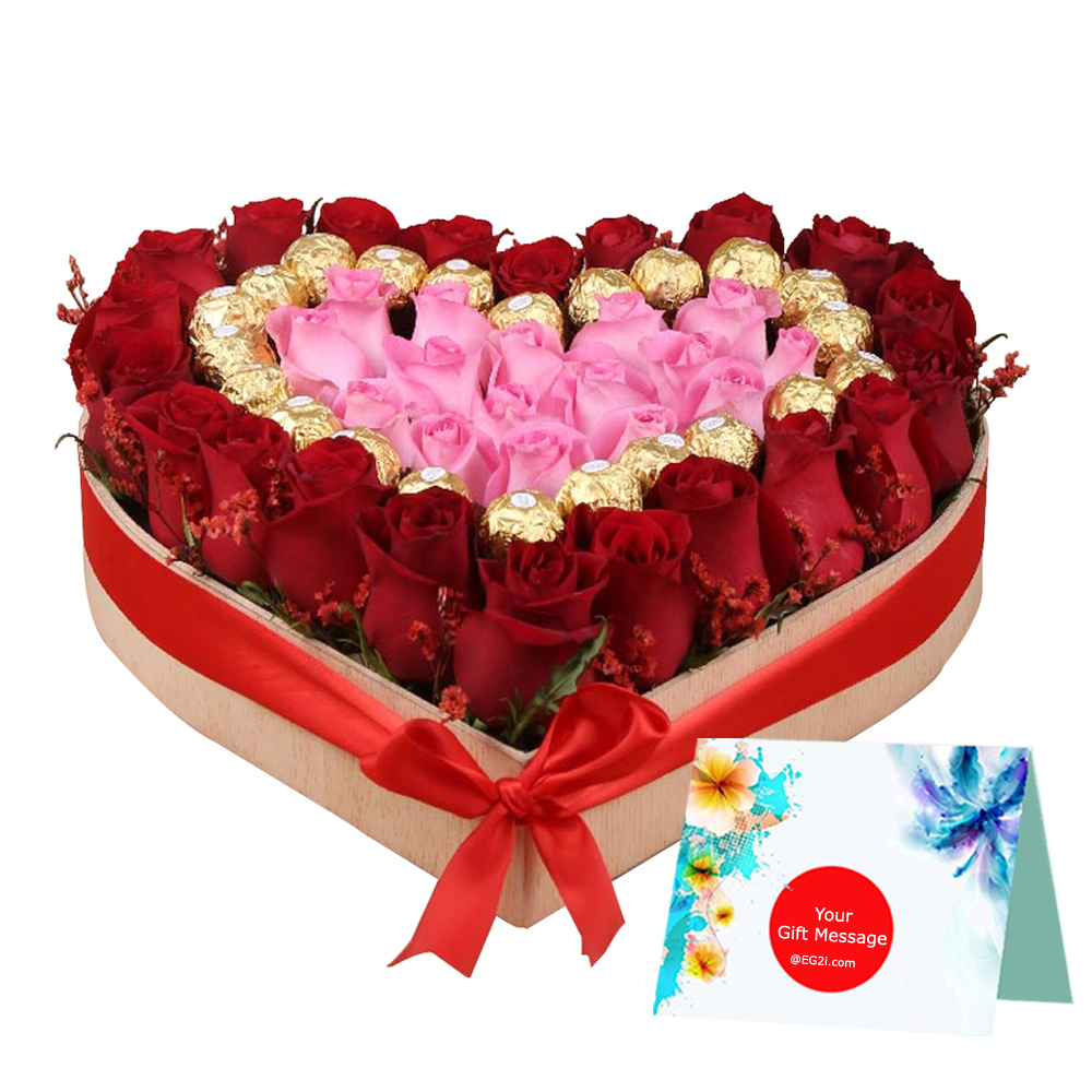 25 Red Roses, 16 Pcs Rocher, 16 Pink Roses Heart Shape Arrangemnet