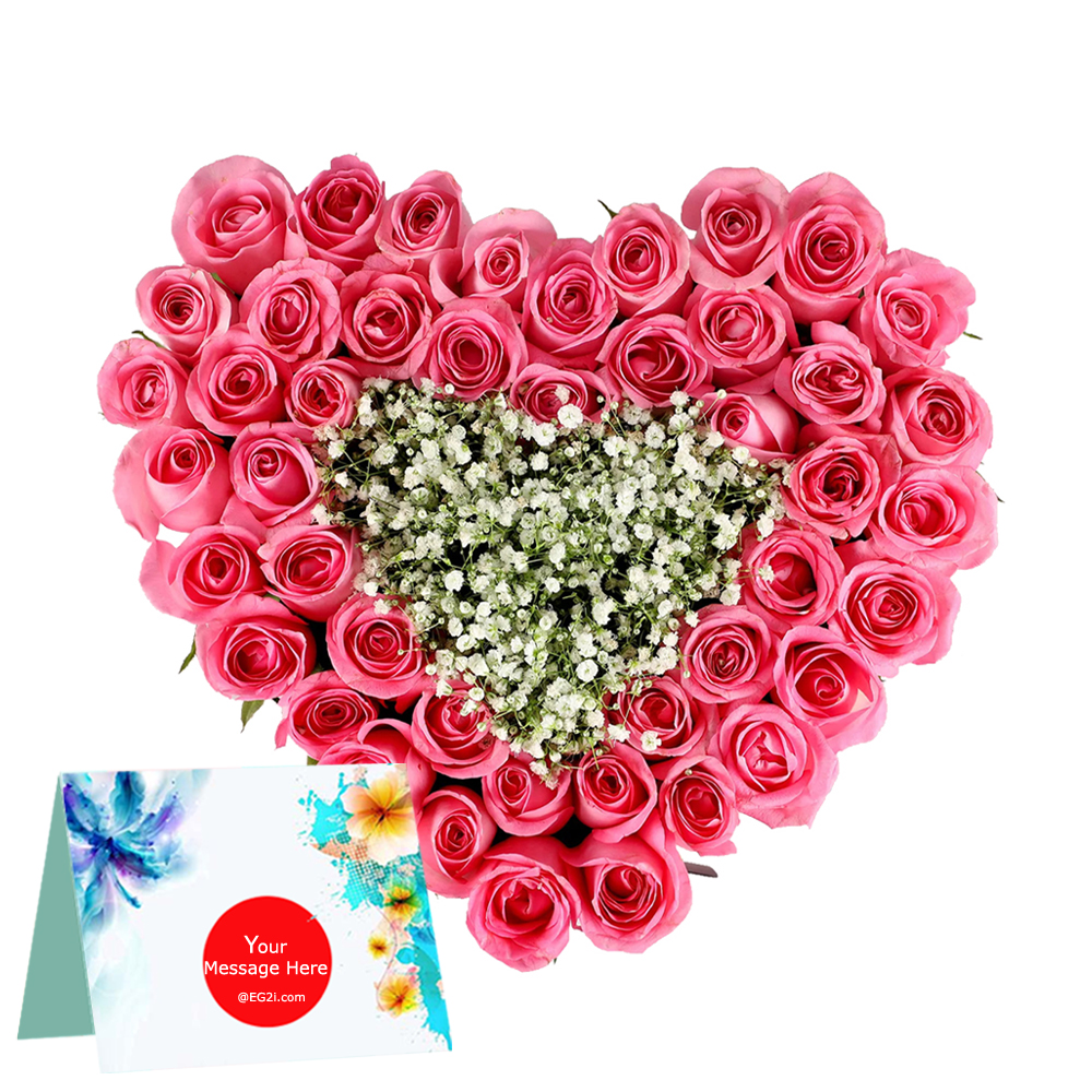 40 Pink Roses Heart Shape Arrangement With Gypsy