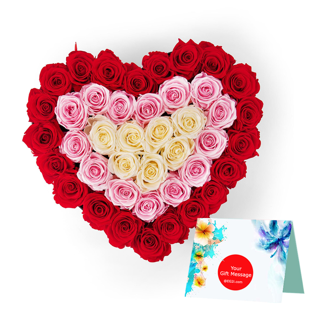 Heart Shape Basket of 40 Pcs Red, Pink and White Roses.