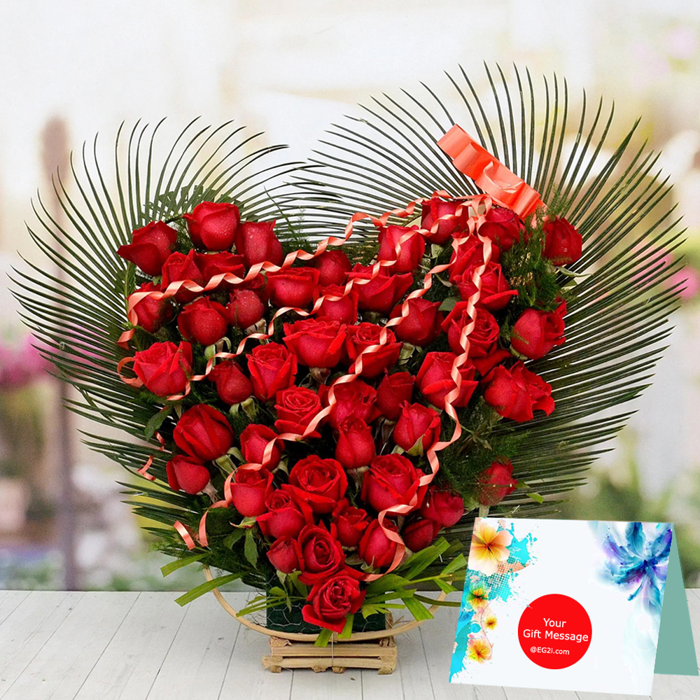 Heart Shape Basket of 40 Red Roses with Green Fillers.