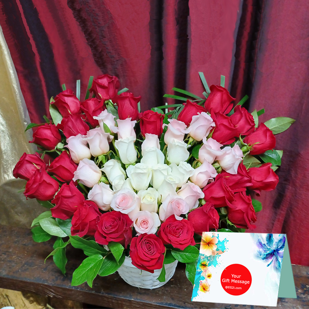 Heart Shape Basket of 50 White, Pink and Red Roses.