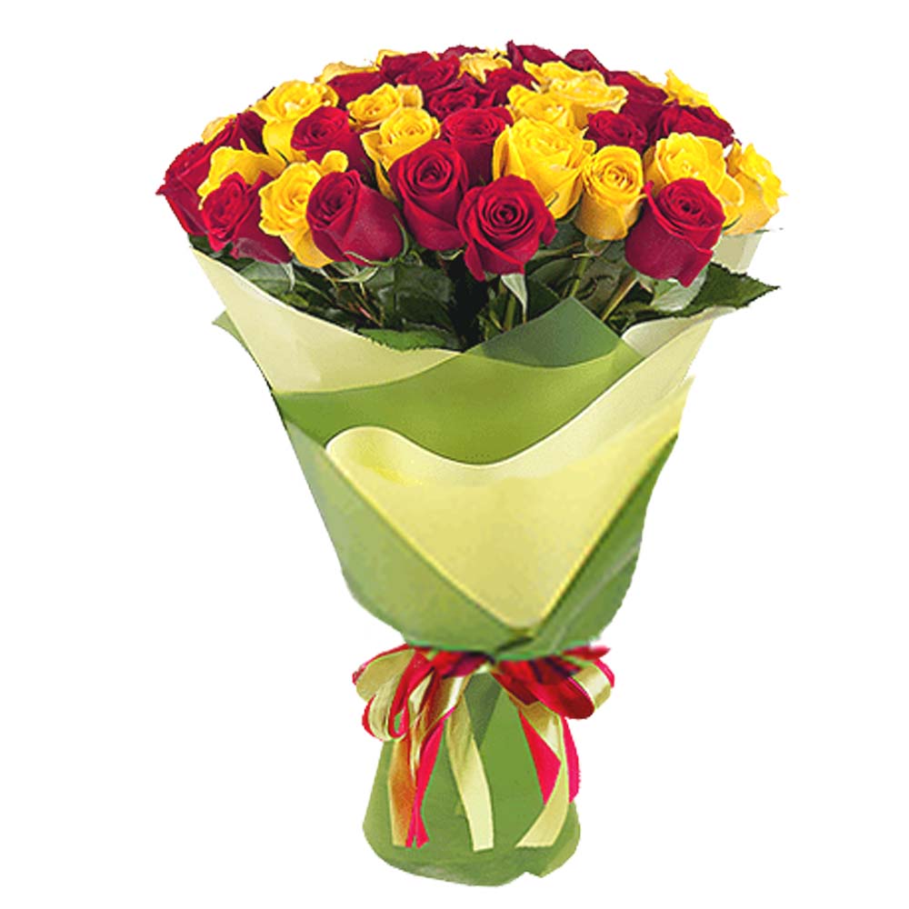 60 Red and yellow Roses with Greenery in A Round Bouquet with White and Green Paper Wrapping Red and yellow Ribbon Bow.