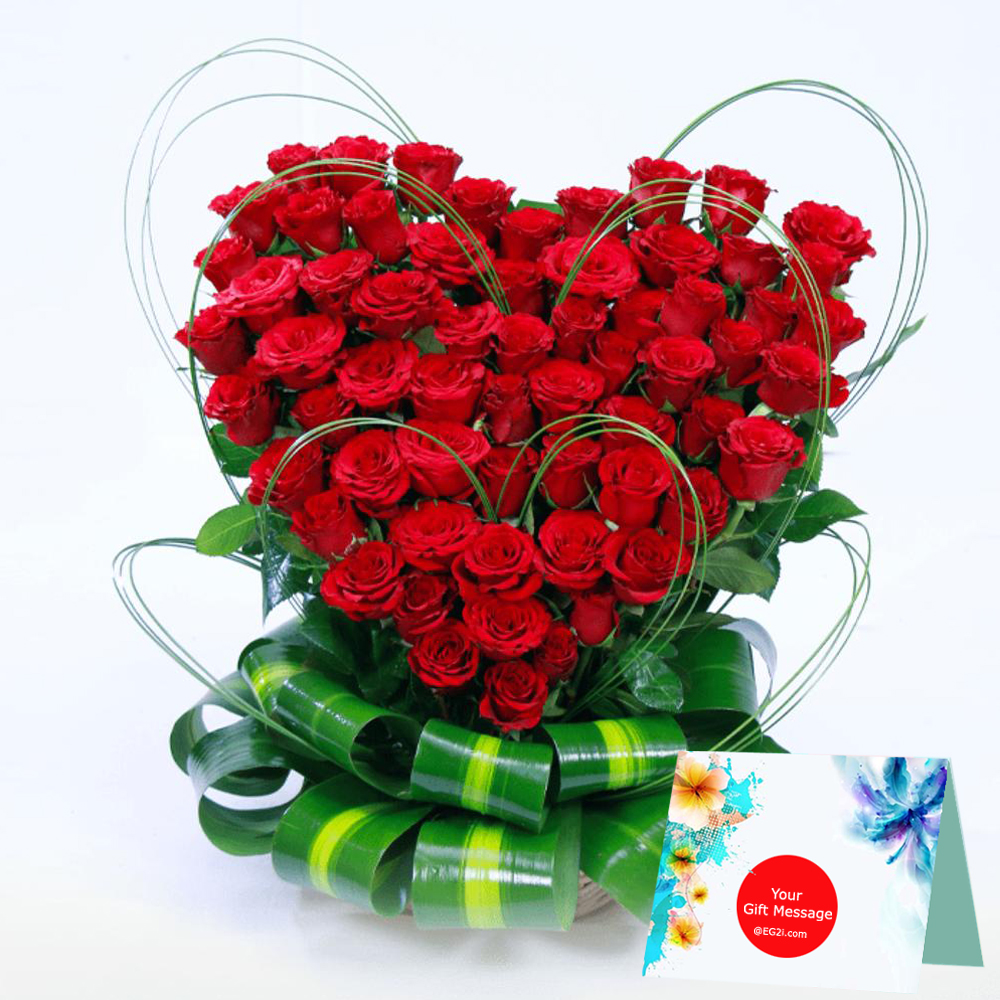 Heart Shape Basket of 75 Red Roses with Green Fillers.