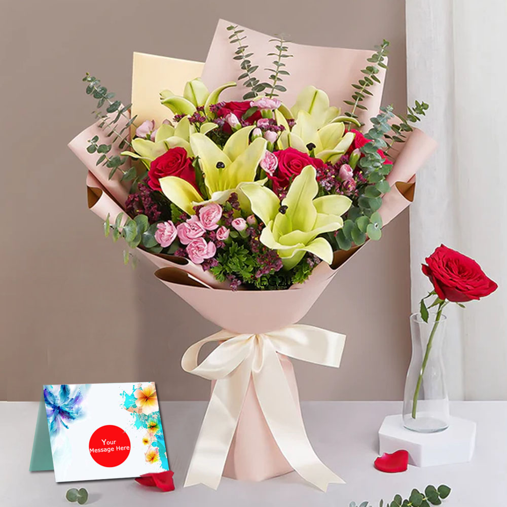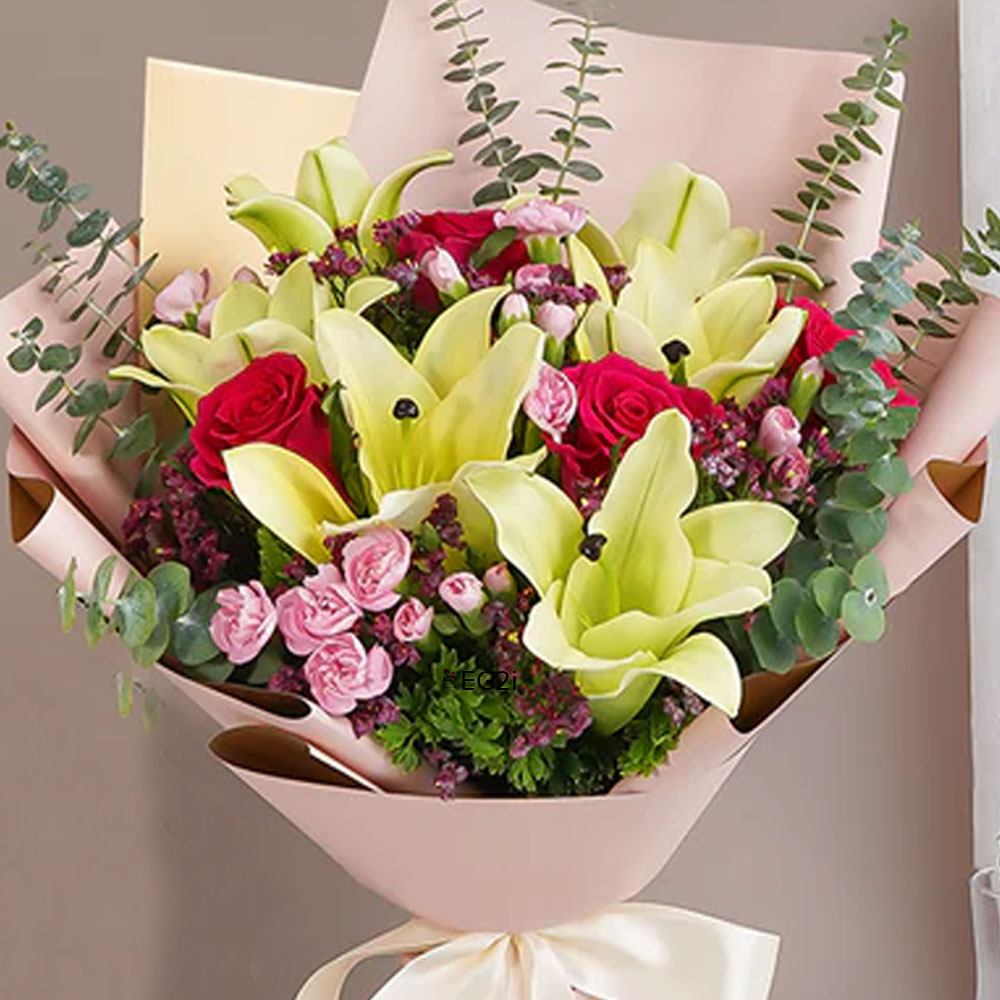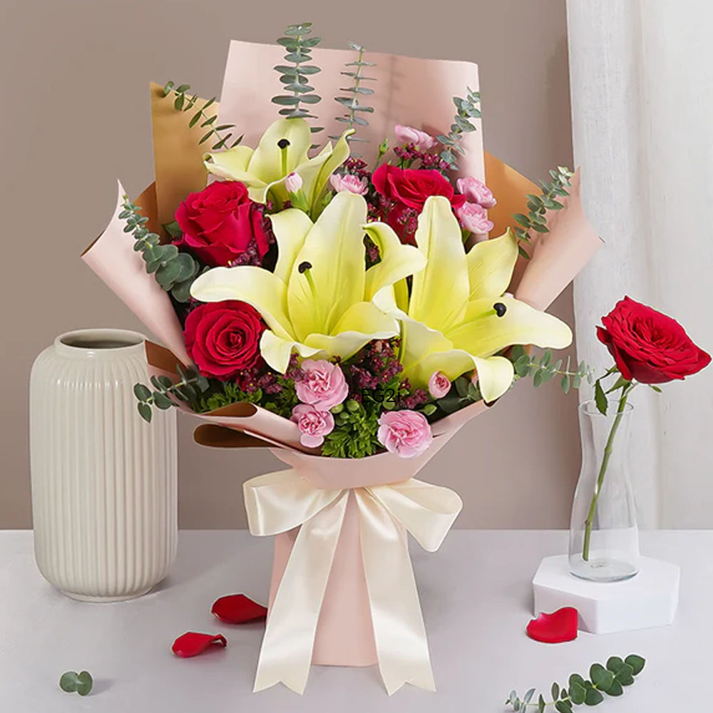 A bouquet featuring lilies, roses, and carnations would create a stunning and fragrant arrangement. The lilies, with their elegant and large blooms, add a touch of sophistication and purity. The roses, symbolizing love and beauty, bring a timeless charm adding depth and a romantic feel. Carnations, known for their frilled edges and long-lasting nature, would fill the bouquet with their full, rounded blooms, enhancing the texture and balance of the arrangement. Together, these flowers would create a harmonious and vibrant bouquet, offering both visual beauty and a delightful fragrance.Send This Exclusive Bouquet anywhere in India for his/her birthday, anniversary, Valentines, mothers day or any other occassions.
