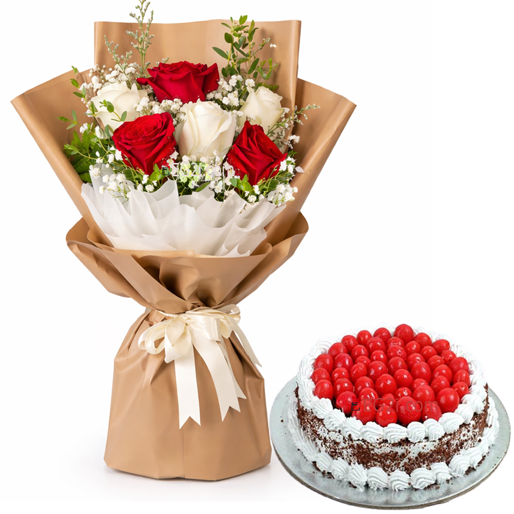 One side Hand bouquet of Roses and Cake.