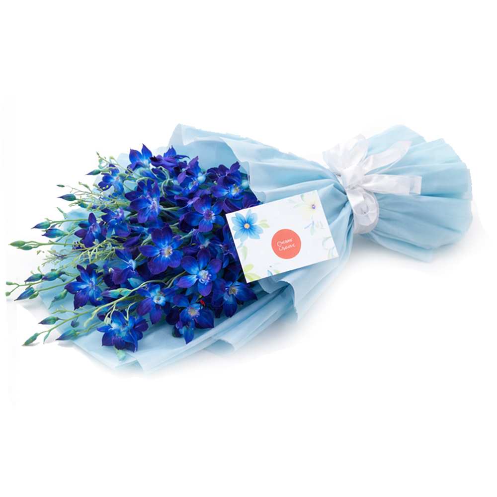 One Side Bouquet of 6pcs Blue Orchids Blue paper wrapping and White Ribbon bow.