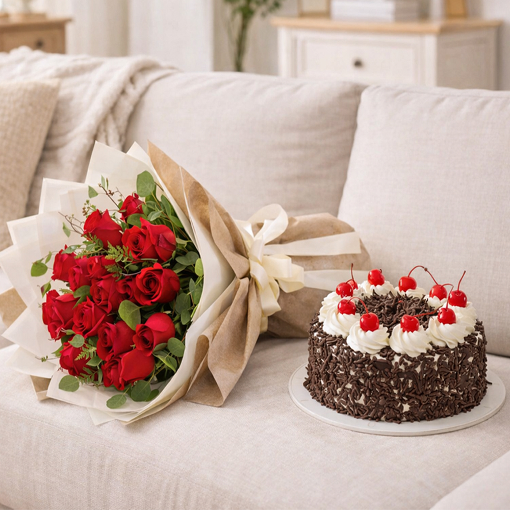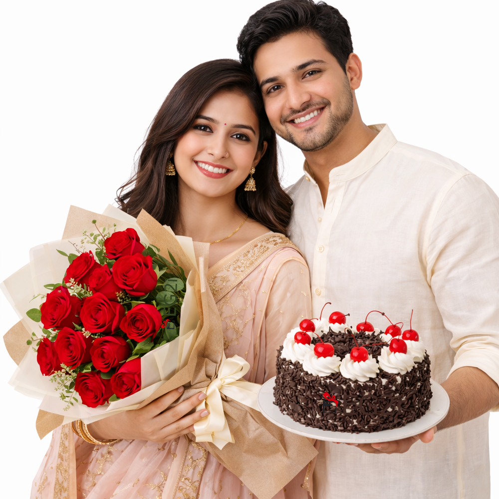 One side Hand bouquet of Roses and Cake.