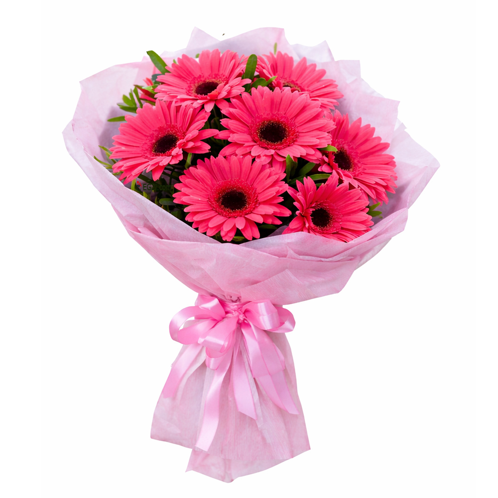 One Side Bouquet of 10pcs Pink Gebera with Greenary and Pink paper wrapping Pink Ribbon Bow.