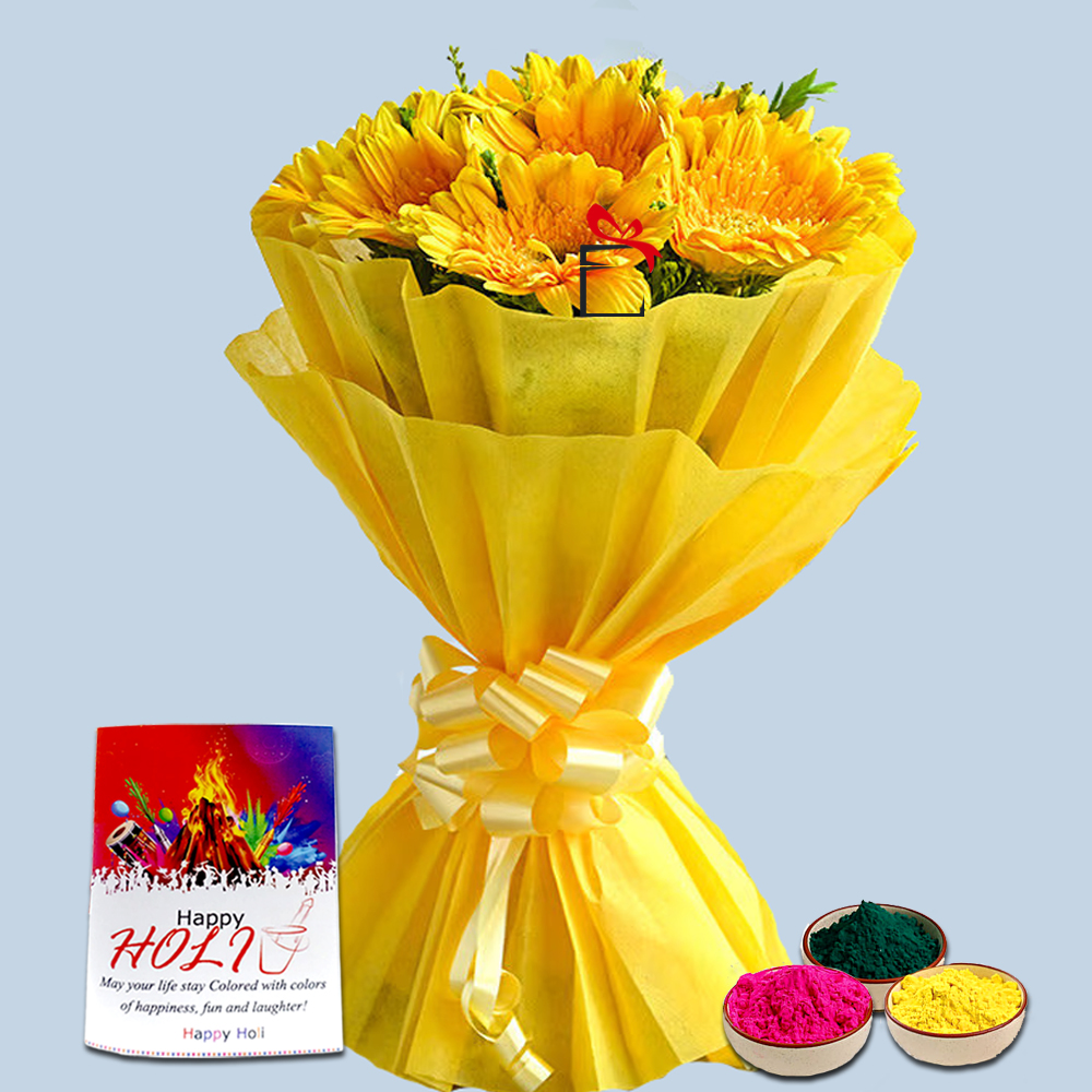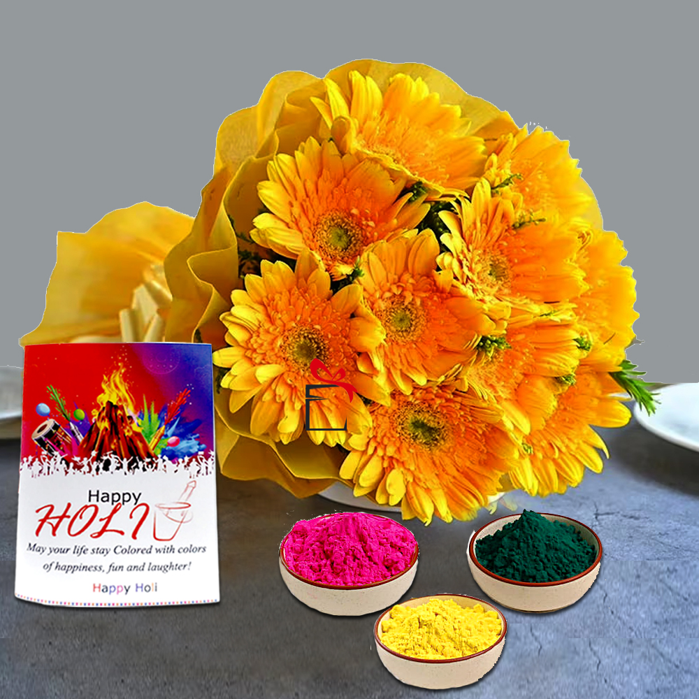 A bouquet of yellow Gerbera flowers can make a cheerful and vibrant Holi gift, symbolizing friendship, happiness, and the spirit of the festival.By presenting a bouquet of yellow Gerbera flowers for Holi, you can convey your warm wishes and spread joy and happiness to your loved ones during this festive occasion.