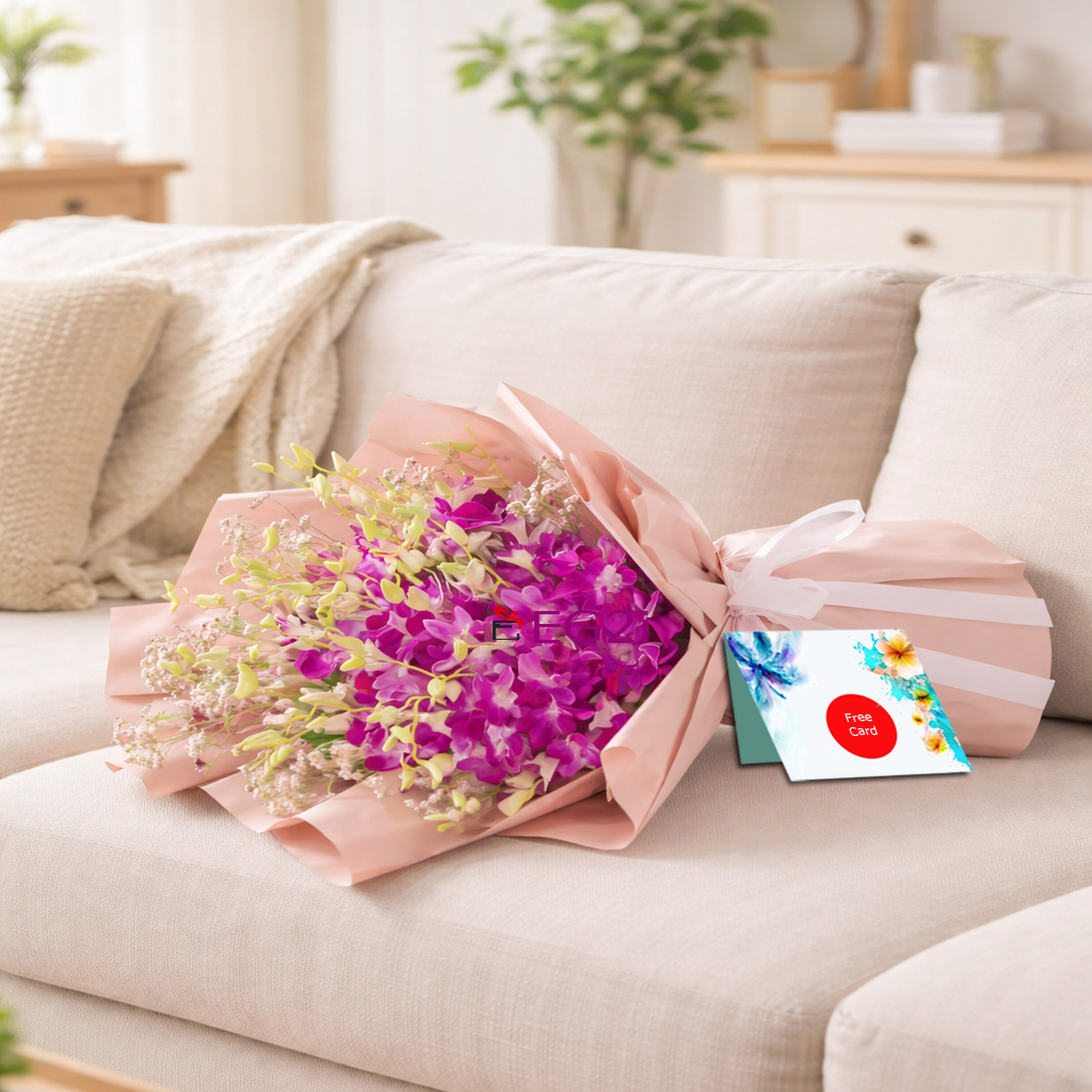 One Side Bouquet of 10Steam Purple Orchid with Greenary Brown paper wrapping with White Ribbon bow.