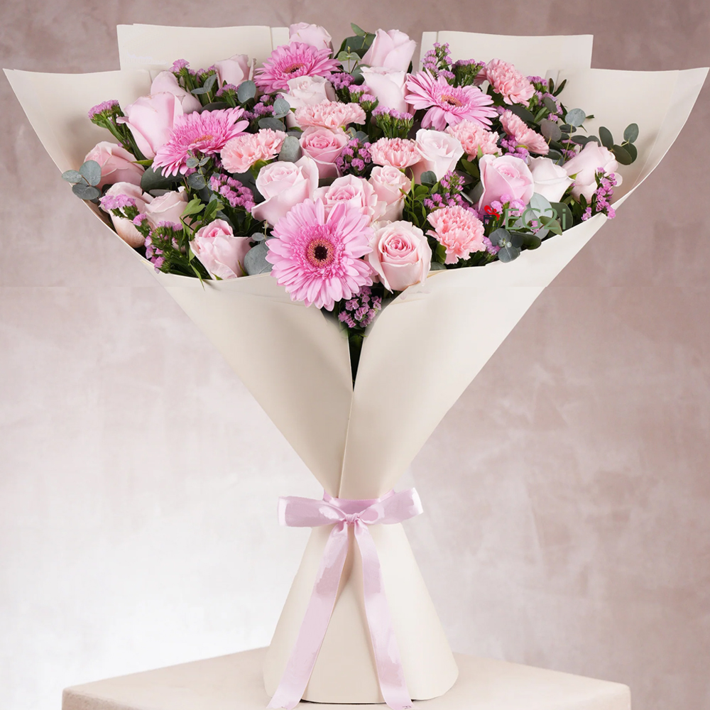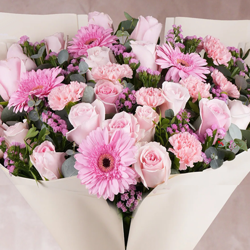 One Side bunch of 20 Pink Roses,20 Pink Carnation and 20 Pink Gerbera and Green fillers.