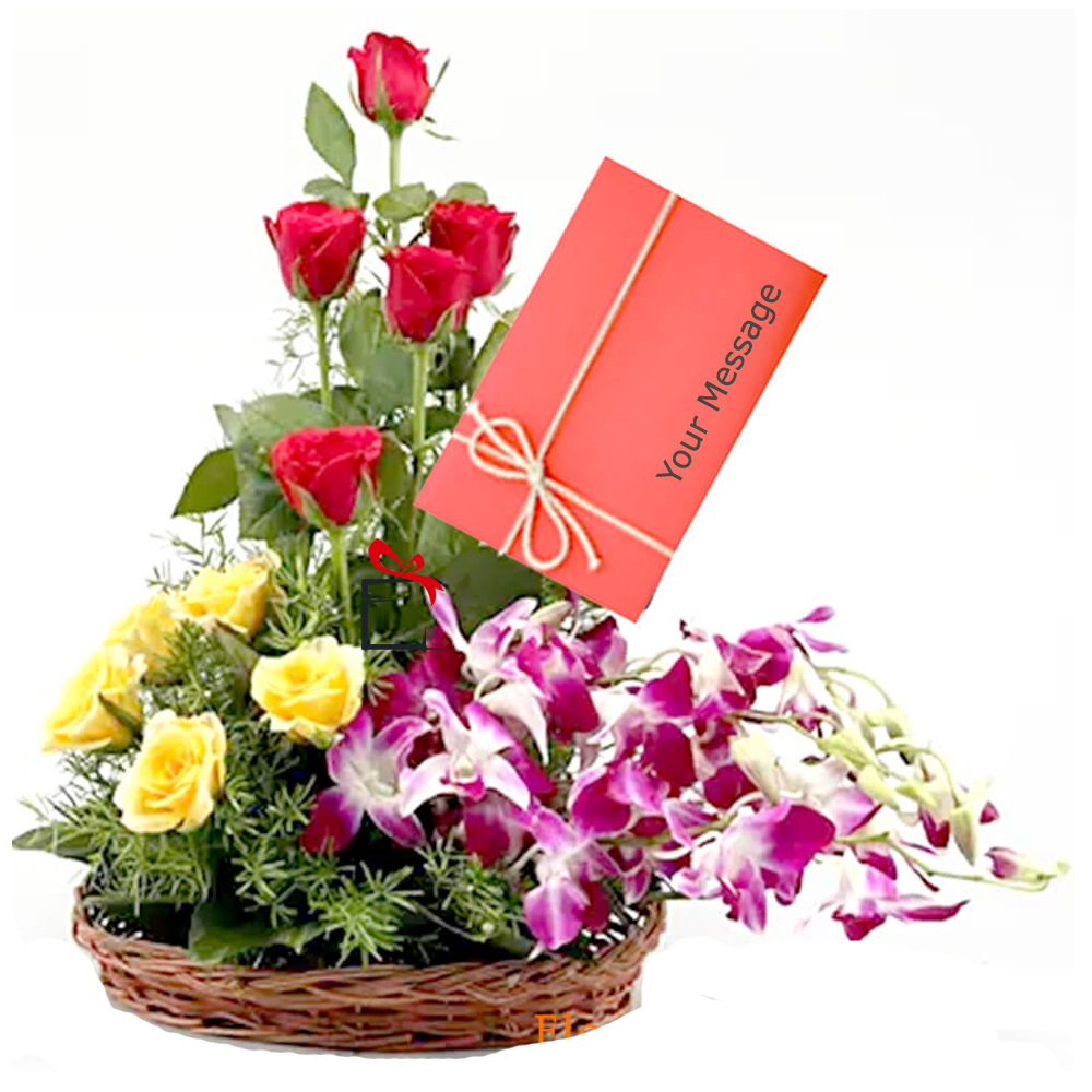 One side basket arrangement of 5pcs Red Roses 5pcs yellow Roses 4steam Purple Orchid with Green Fillers.