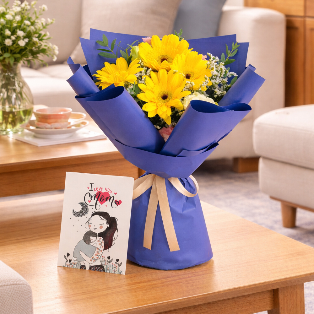 Celebrate your mom with this beautiful Mother�s Day flower bouquet featuring fresh gerbera and roses wrapped in elegant premium paper and tied with a soft ribbon. Paired with a lovely �I Love You Mom� greeting card this bouquet is the perfect way to express your love gratitude and appreciation.