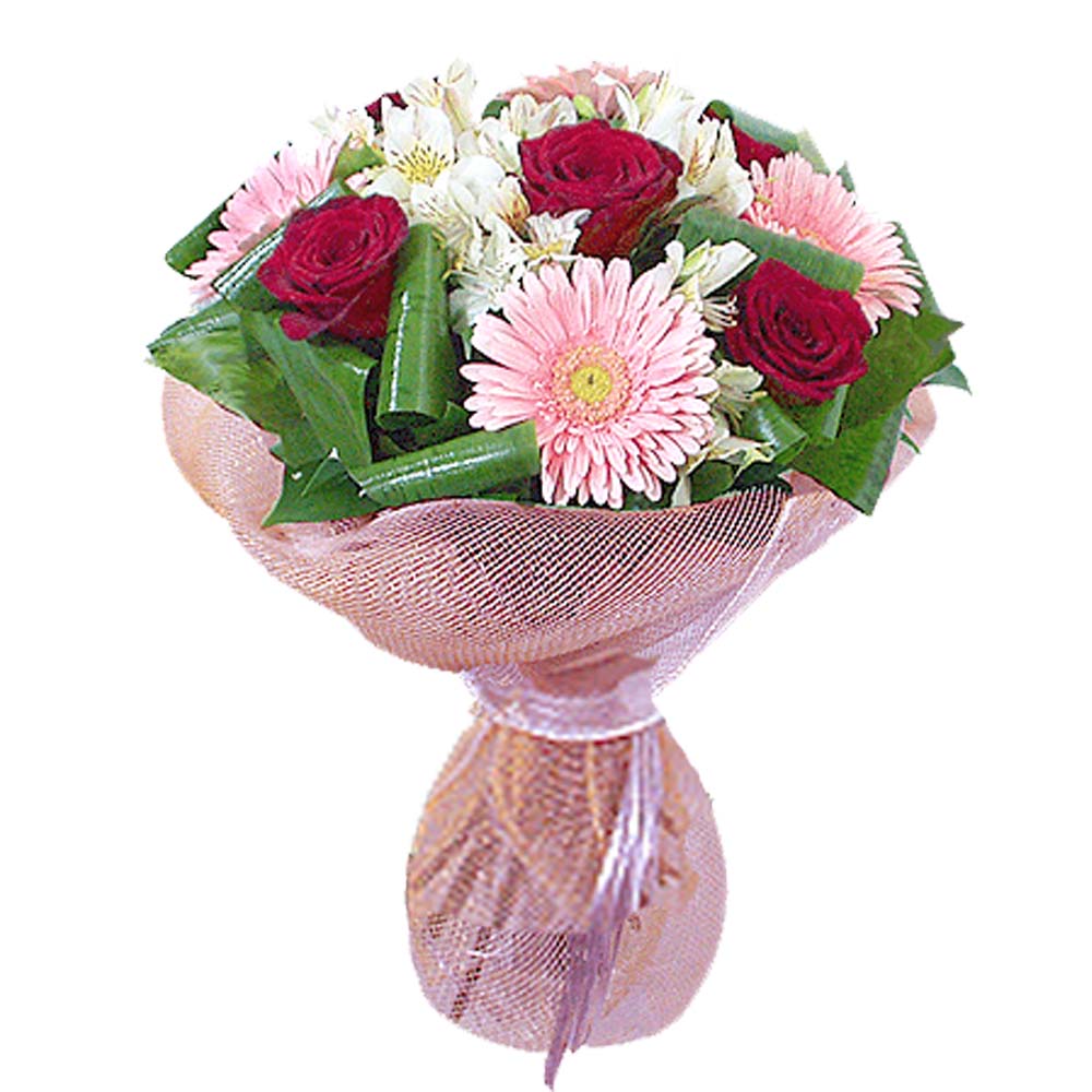 8 Red Roses and 10 Pink Gerbera with Greenery in A Round Bouquet, White Paper/Net Wrapping White Ribbon Bow.