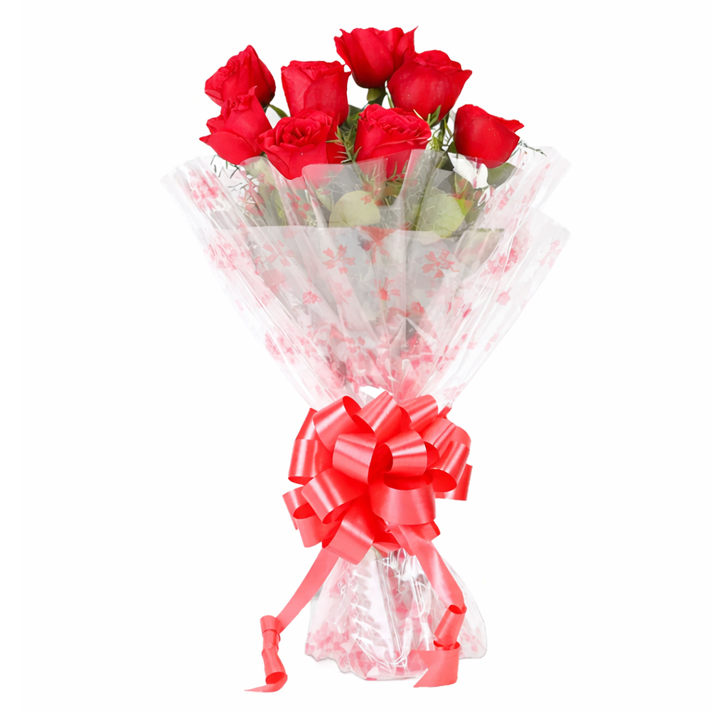 Round Bunch of 10pcs Red Roses Celophane wrapping and Red Ribbon bow.