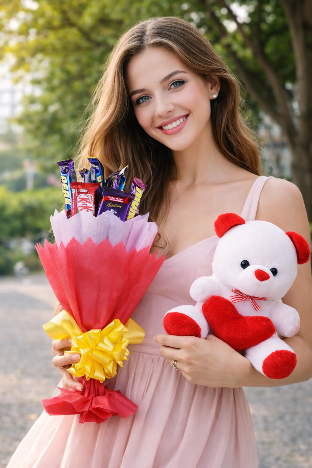 Round bouquet of Mixed Chocolates Pink and Red Non Woven paper wrapping and Yellow Ribbon bow.(as Image)