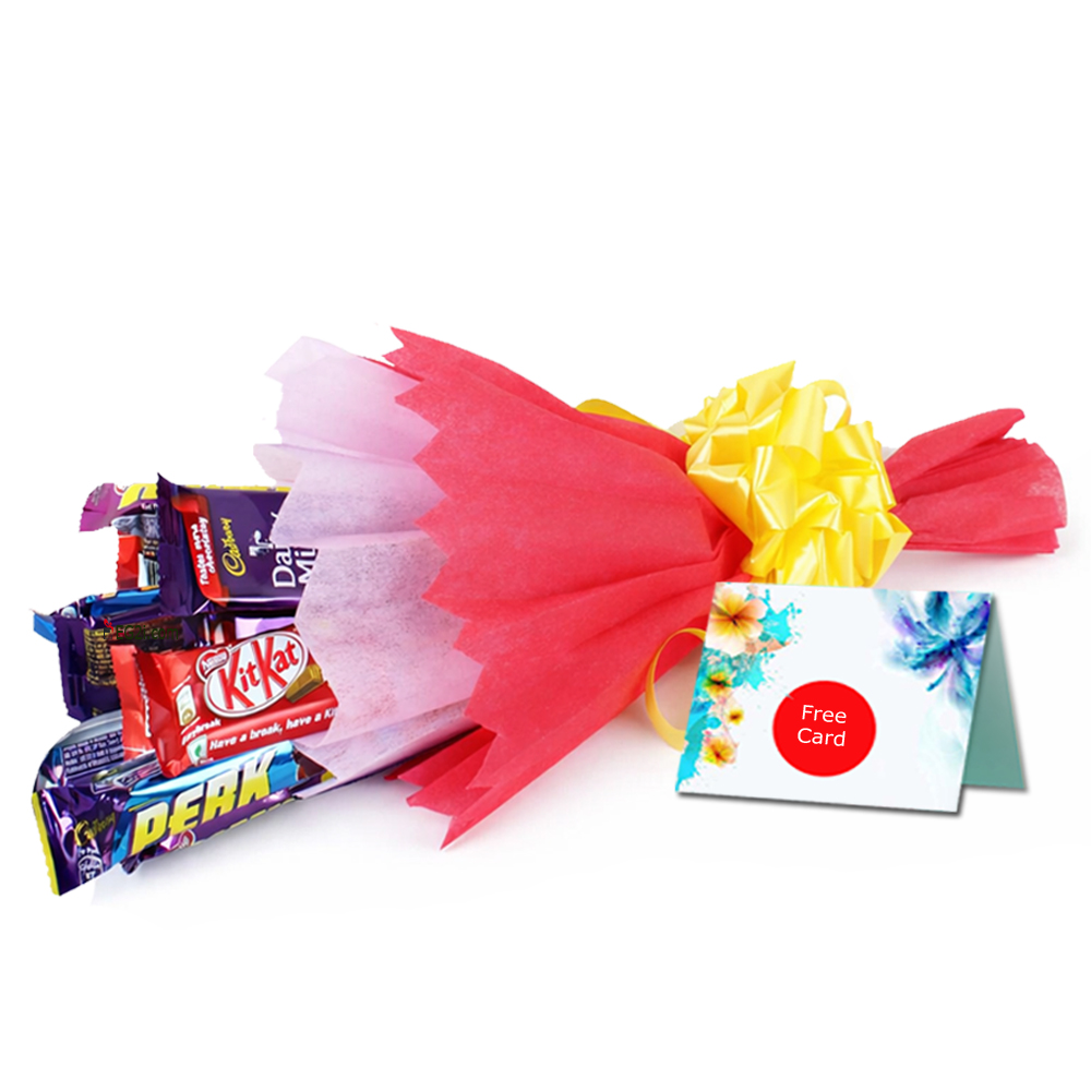 2pcs Perk 2 pcs dairy Milk 2pcs Kitkat 2pcs Five star 2pcs Munch.