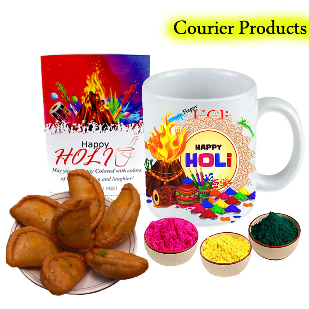 Send a Holi celebration Theme Coffe Mug with Sweets on this Holi with the holi Color and Holi Wishig Card.
