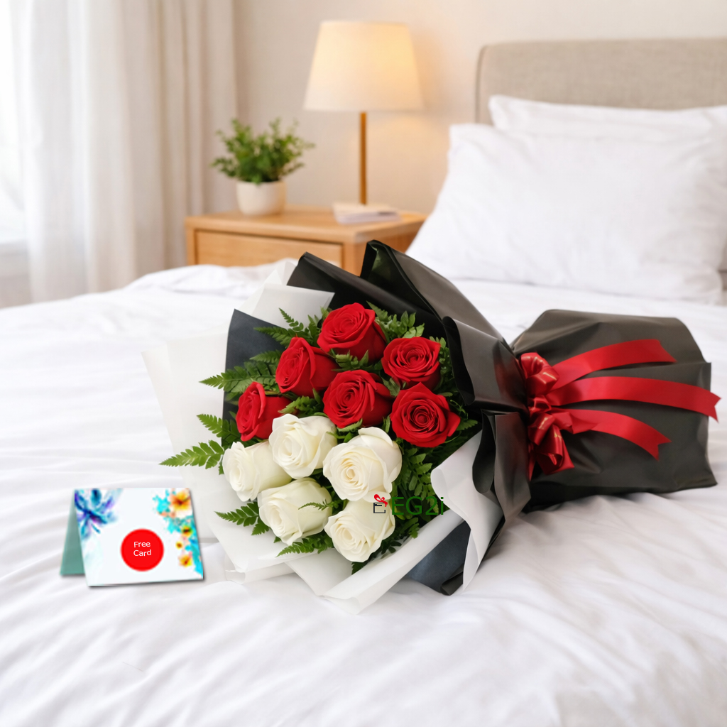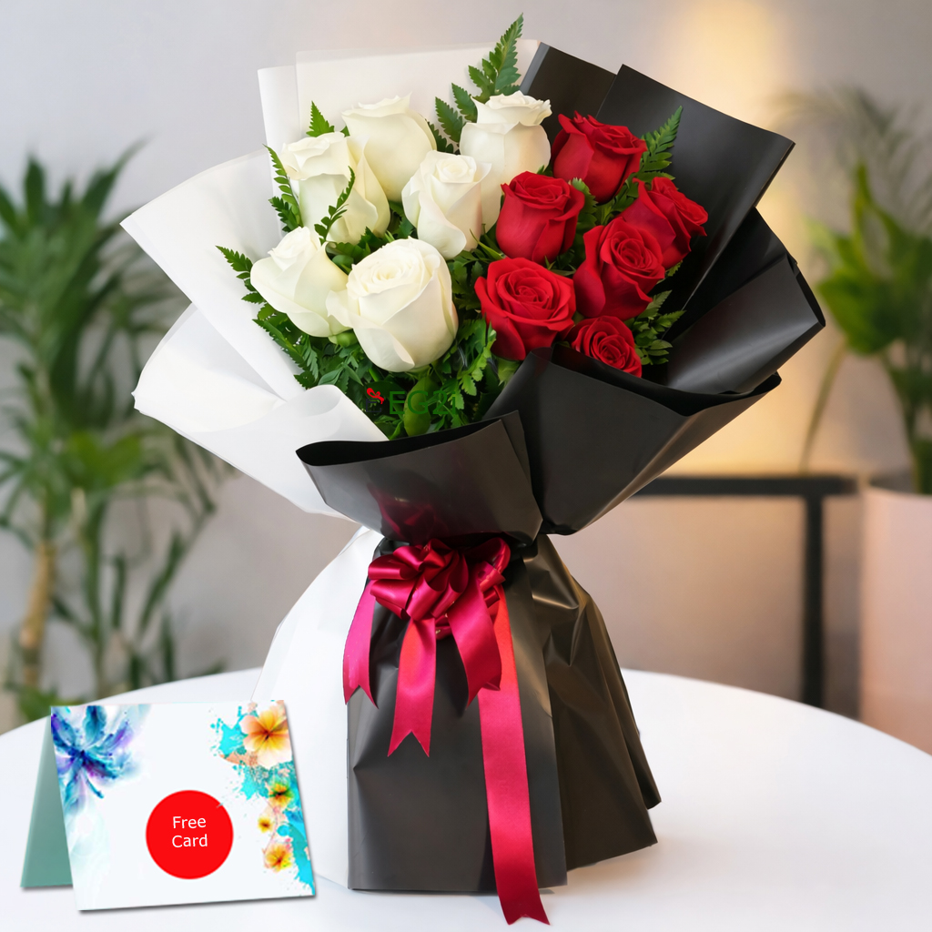 One Side Bouquet of 12pcs Red and White Roses with Greenary Black and White paper wrapping with Red ribbon bow.