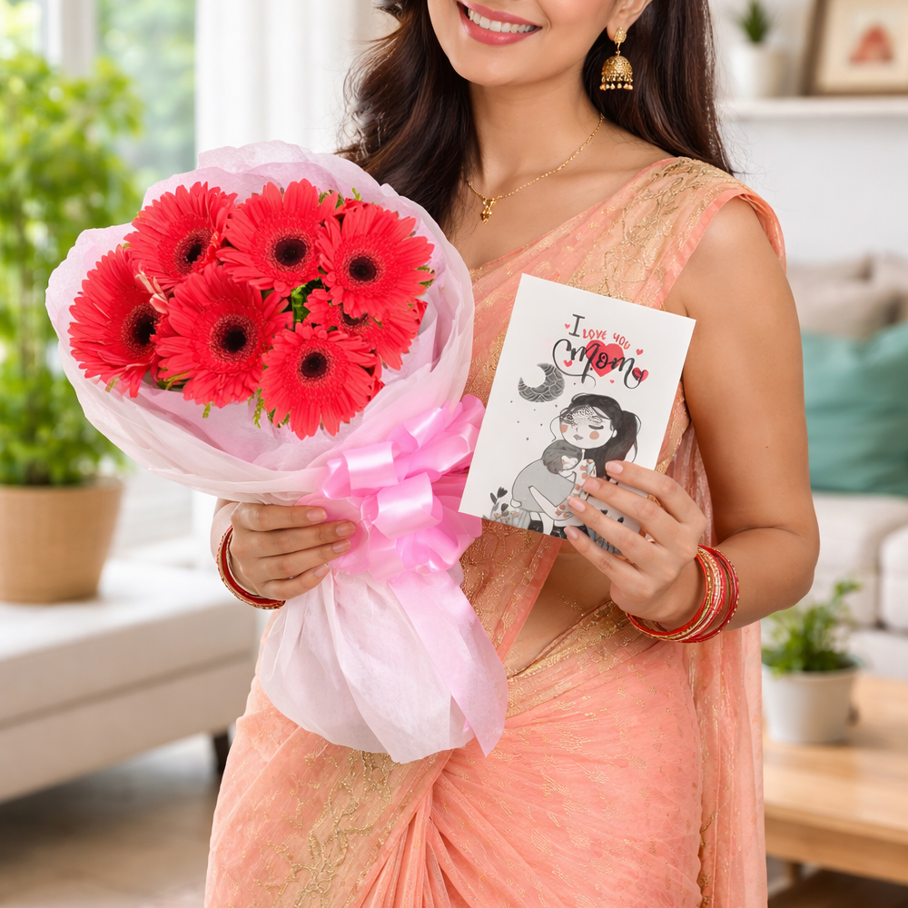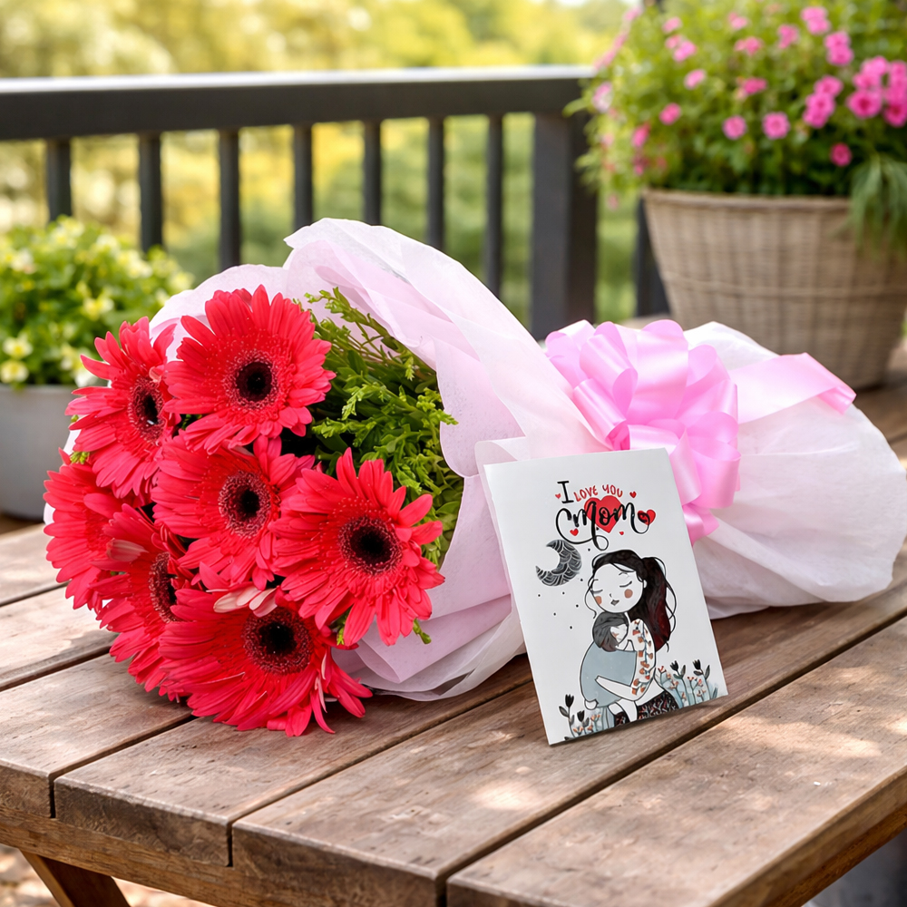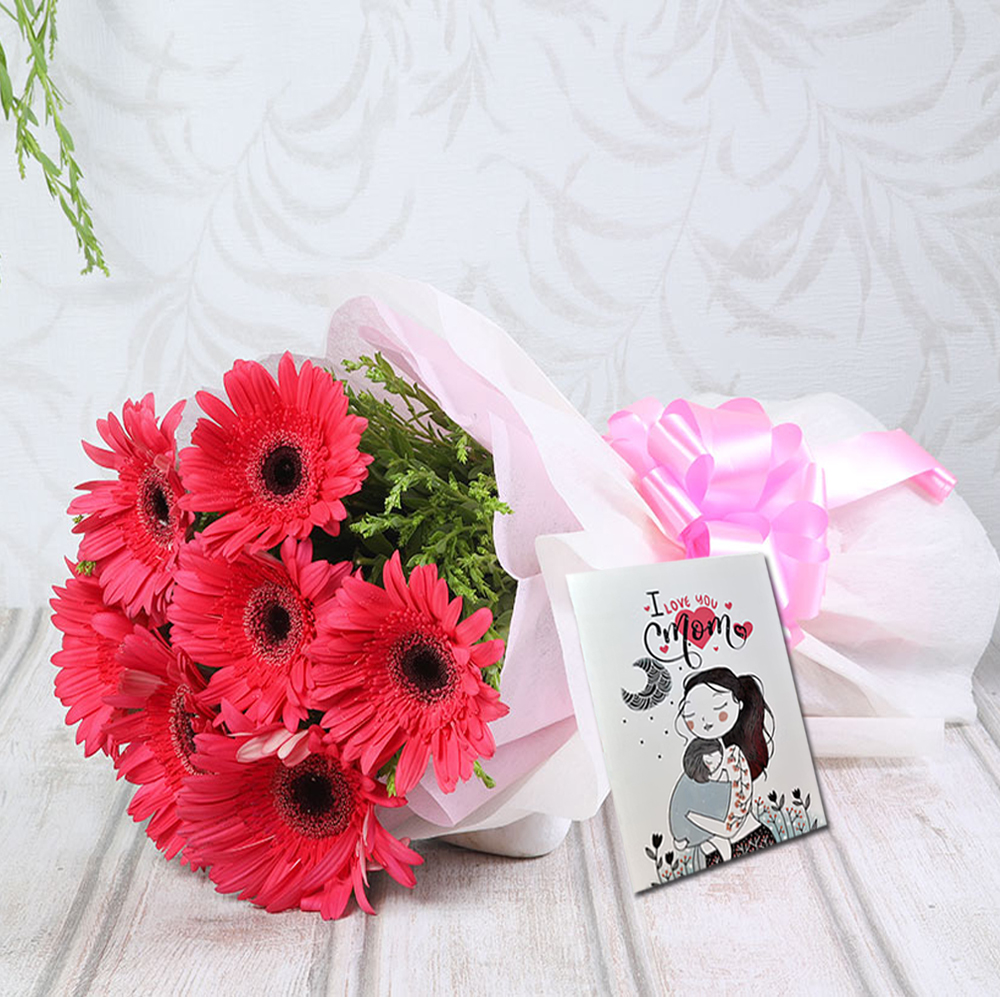 Celebrate your mom with this beautiful Mother�s Day flower bouquet featuring fresh gerbera wrapped in elegant premium paper and tied with a soft ribbon. Paired with a lovely �I Love You Mom� greeting card this bouquet is the perfect way to express your love gratitude and appreciation.