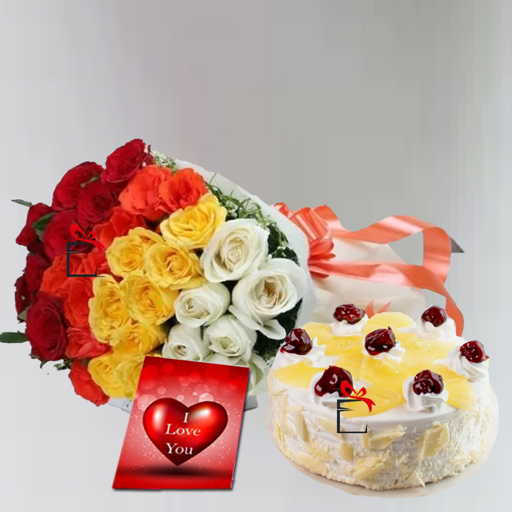 Pairing mixed roses with a pineapple cake is a delightful choice that combines the vibrancy of colorful roses with the tropical and refreshing flavor of pineapple.Book your Valentine or Love of combo roses with a cake online now.