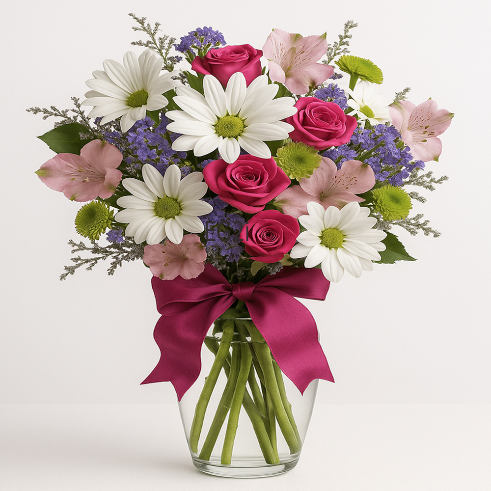 Pretty Please is a lovely mix of fresh flowers in breezy shades of pink white lavender all tied up with a big pink bow. A mix of fresh flowers such as spray roses daisy and button spray chrysanthemums Monte Cassino asters and lionium in shades of white pink green purple and lavender. One-sided Shippine Area: