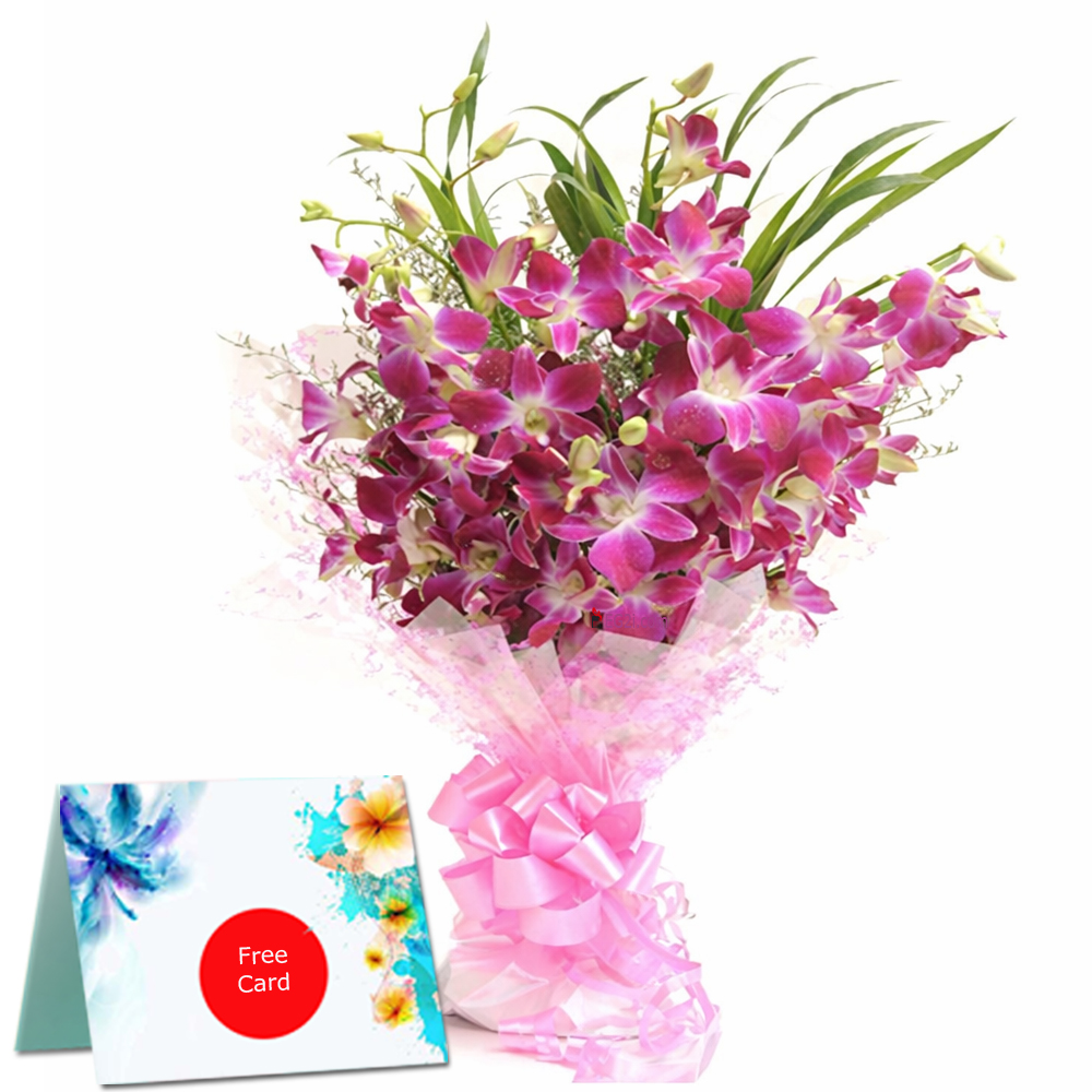 One Side Bouquet of 6pcs Purple Orchid Celophane wrapping Pink Ribbon Bow.