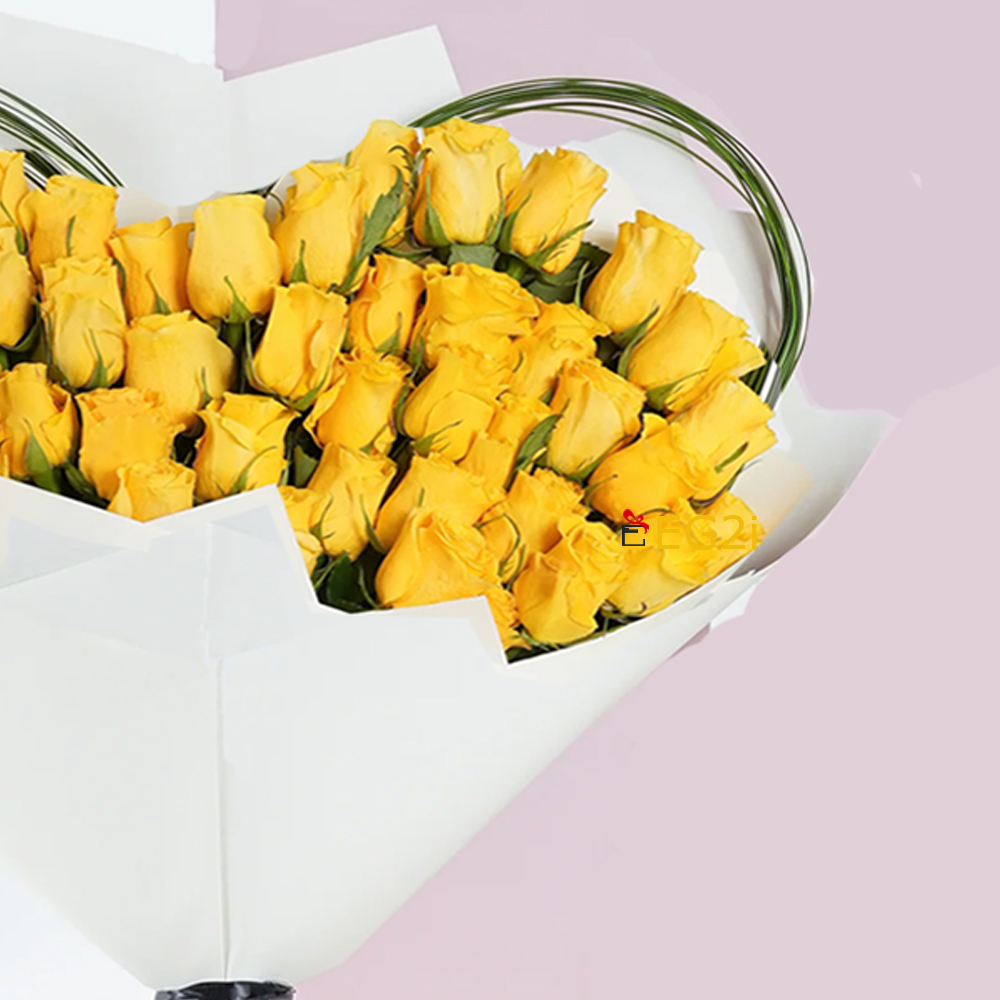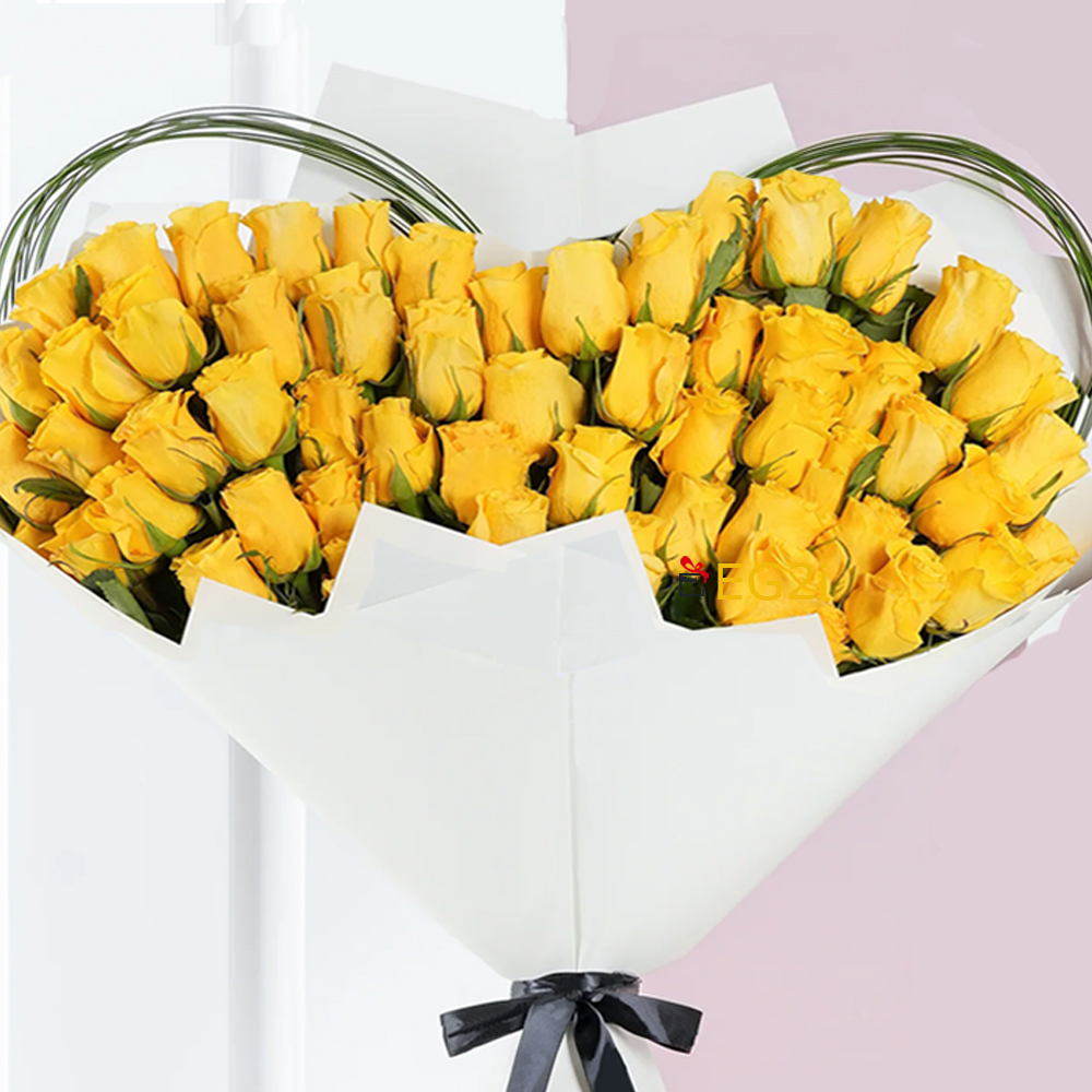 One side bunch of 75pcs Yellow Roses With White paper wrapping Black Ribbon bow and Green Leaves.