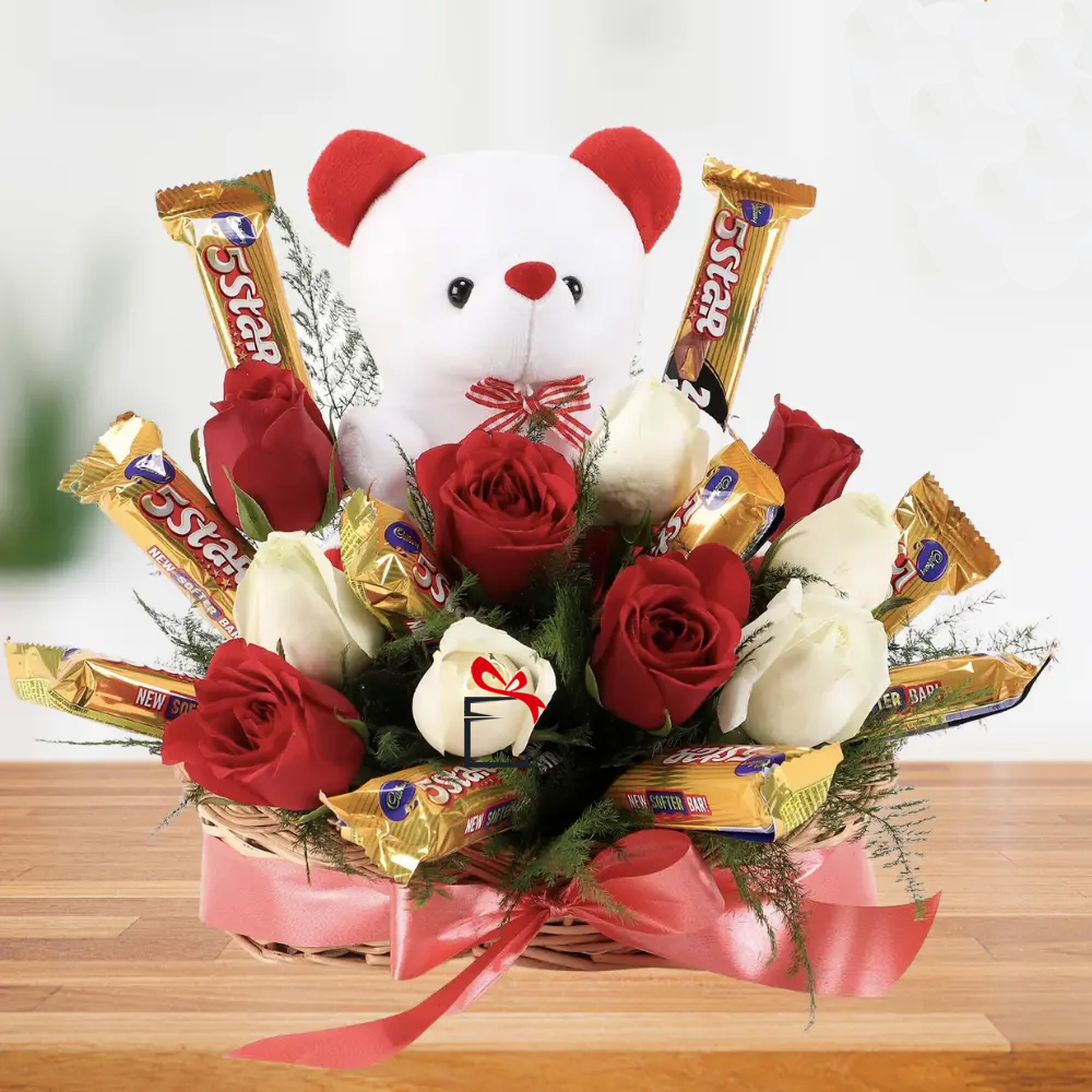 Basket of 5 Red Roses 5 White Roses 10pcs Five Star Chocolate with 6inch White Teddy bear.