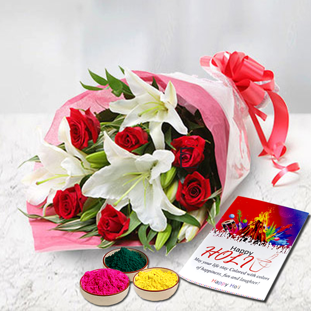 A bouquet of red roses and white lilies for Holi is a timeless and sophisticated gift that combines the beauty of two classic flowers to celebrate the joy and spirit of the festival in a graceful and elegant manner.Send This Flowers Bouquet with Holi color to your dear one online.
