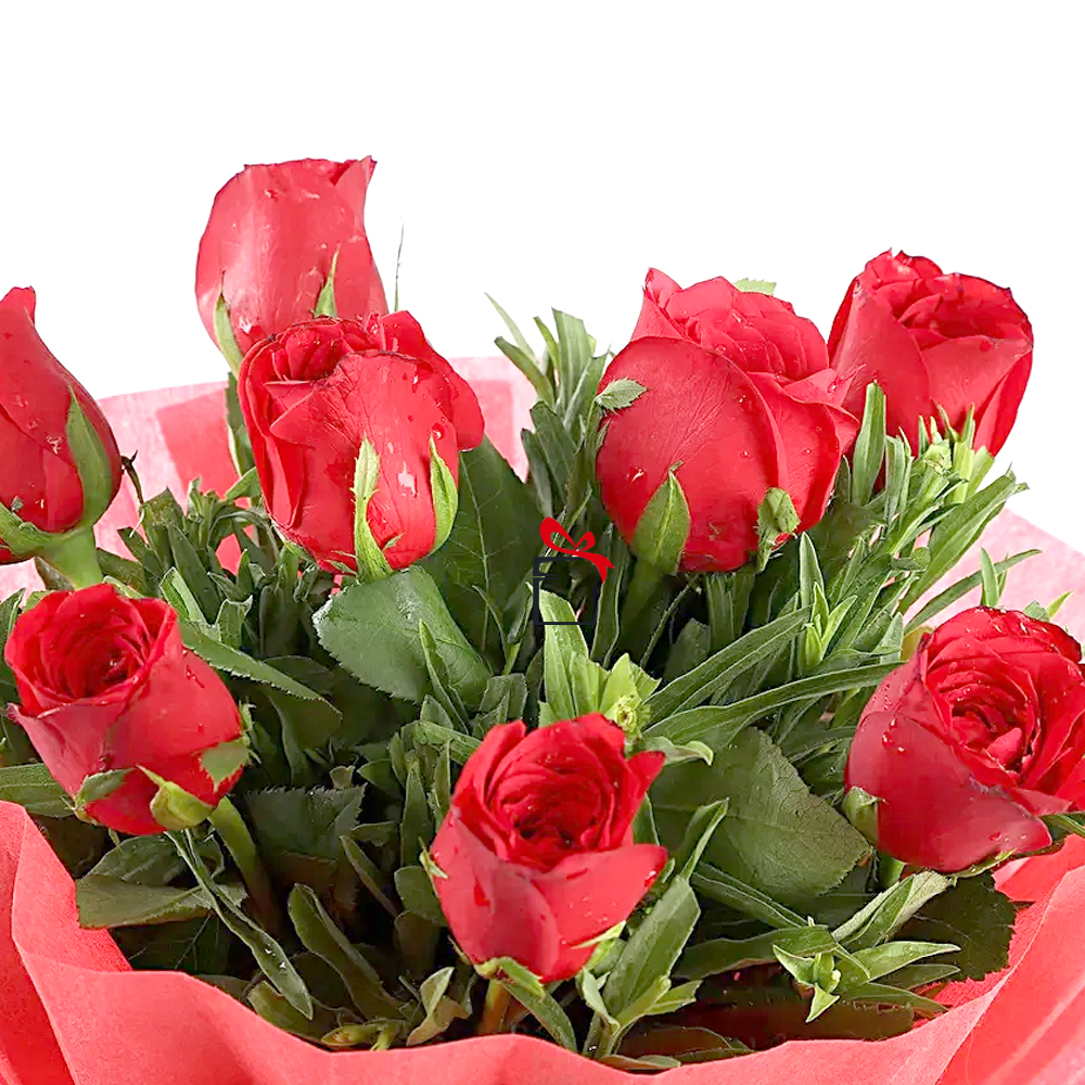 12 Red Roses double Red paper wrapping Red and White Ribbon Bow.