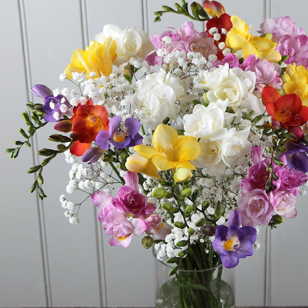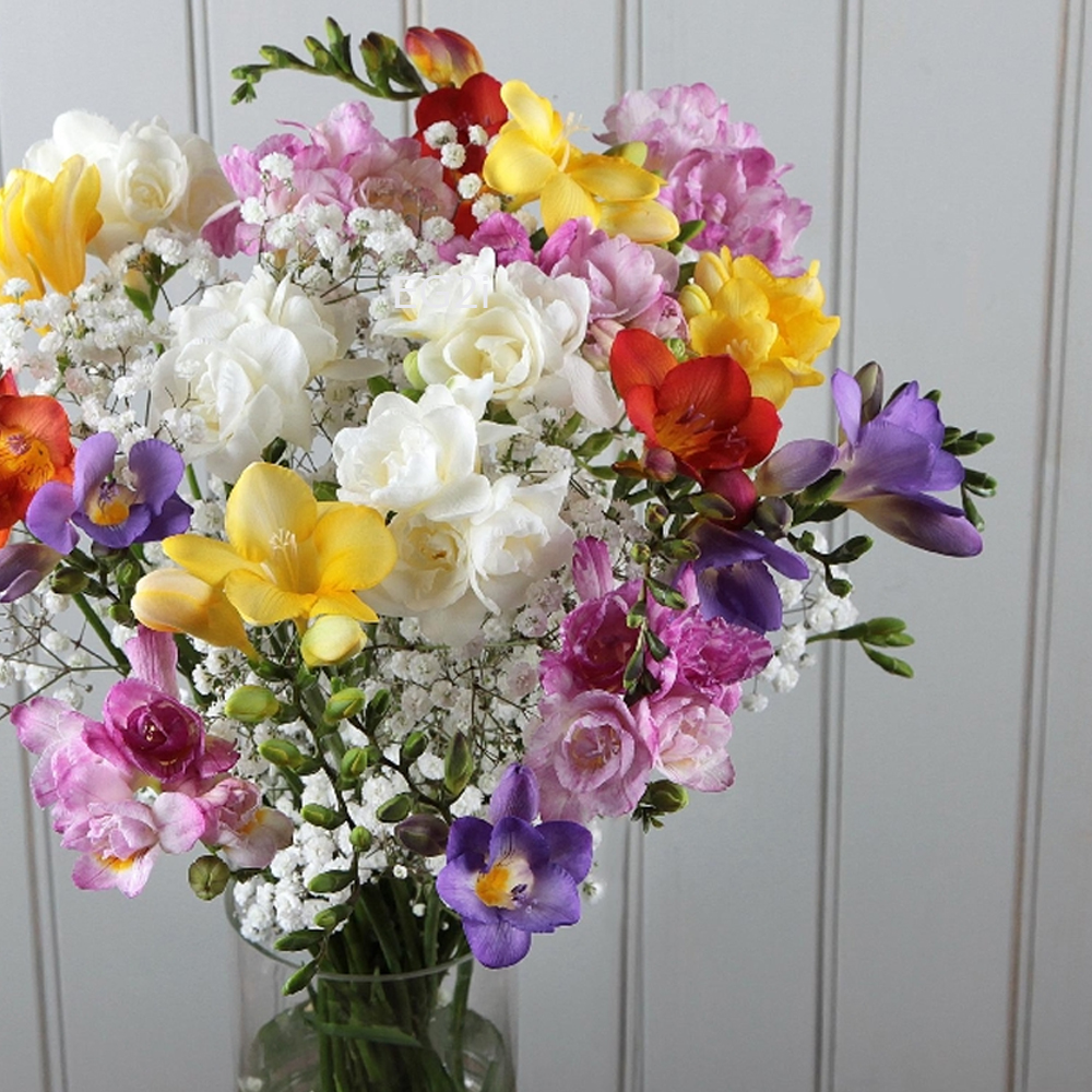 Send someone special the sweet-smelling fragrance of 15/20/30 long-stemmed Freesia in beautiful mixed colours with Gypsophilia