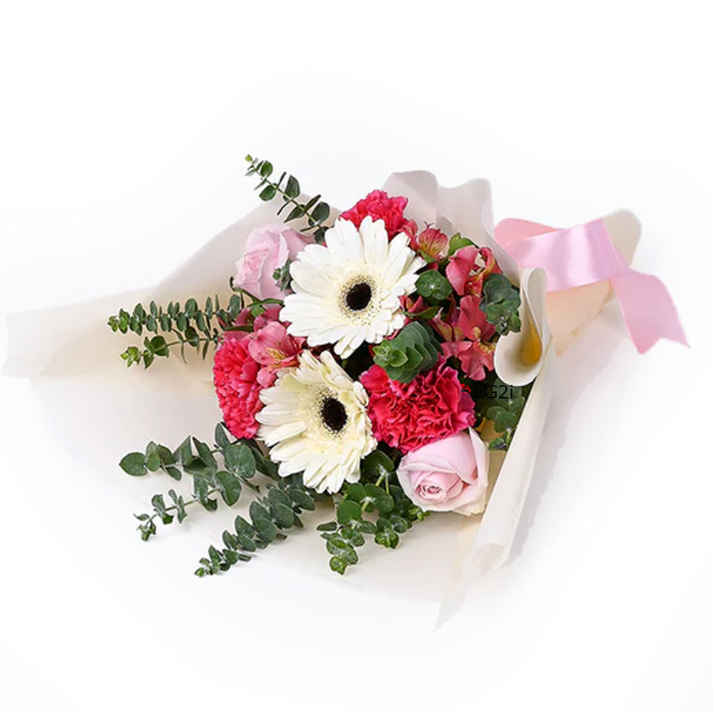 A bouquet of pink roses dark pink carnations and white gerbera daisies would create a beautifully balanced and vibrant arrangement blending elegance with boldness and purity. The pink roses with their soft layered petals symbolize admiration grace and gentle affection adding a touch of romance and elegance to the bouquet. The dark pink carnations with their rich ruffled blooms bring depth and a sense of passion symbolizing love and fascination. The white gerbera daisies with their bright daisy-like petals offer a refreshing contrast symbolizing innocence purity and cheerfulness.