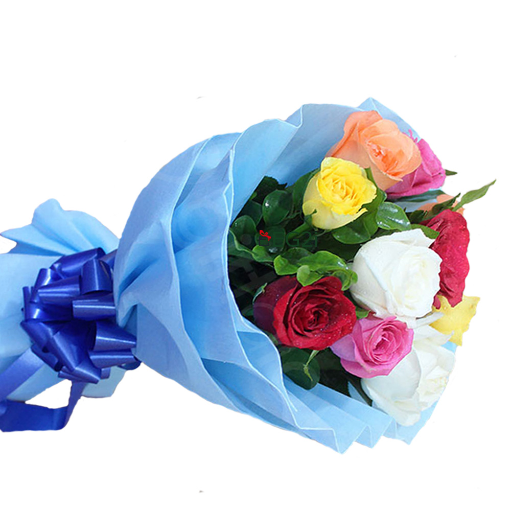 10Mixed Color Roses Blue Paper wrapping Blue Ribbon bow.