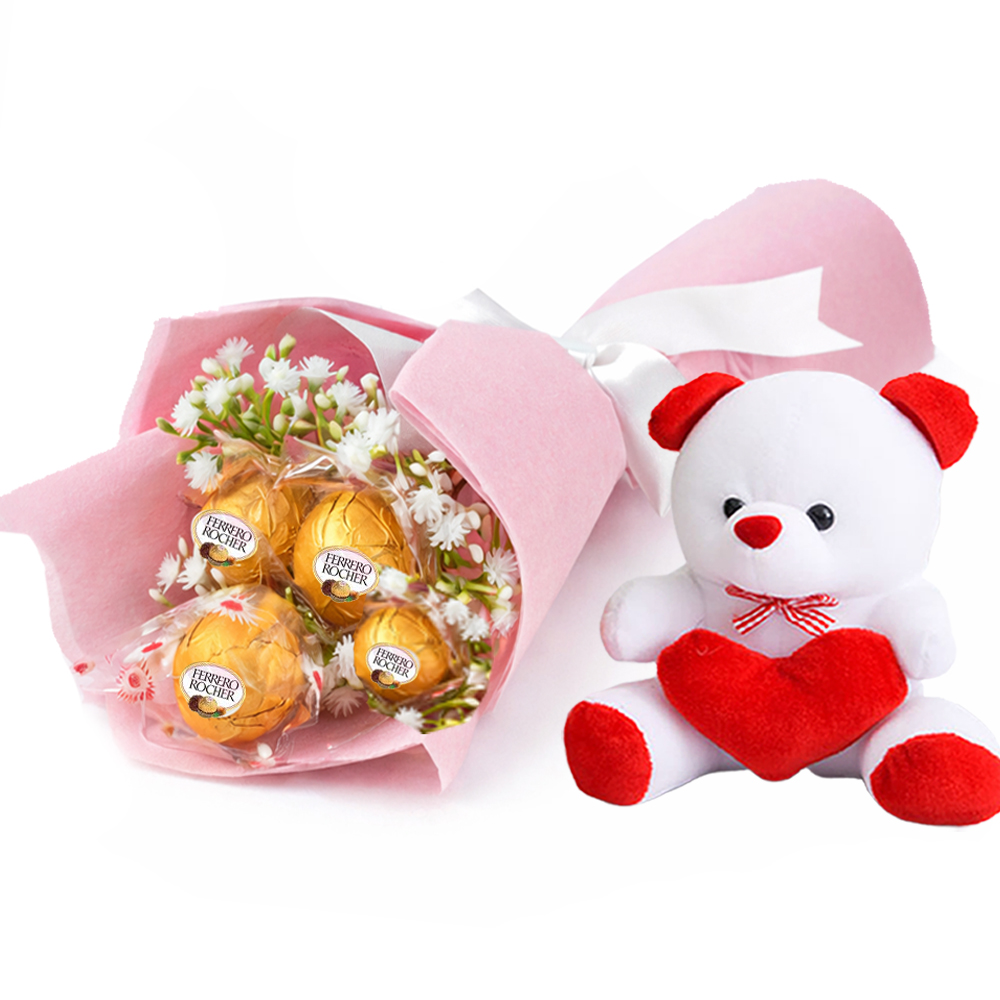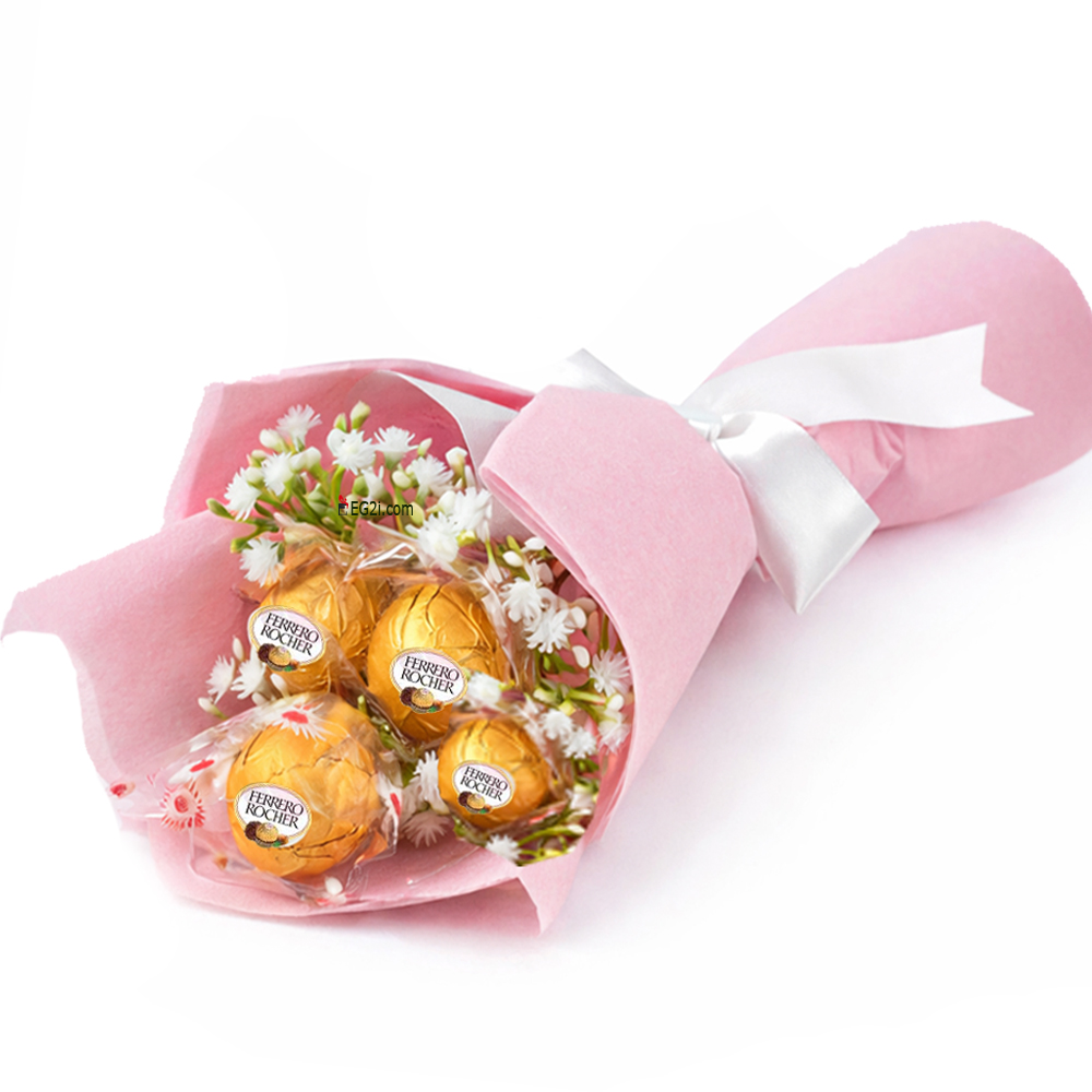 One Side bouquet of Ferrero Rocher with Gypsy/Greenary Pink Non Woven paper wrapping and White Ribbon bow.(as Image)