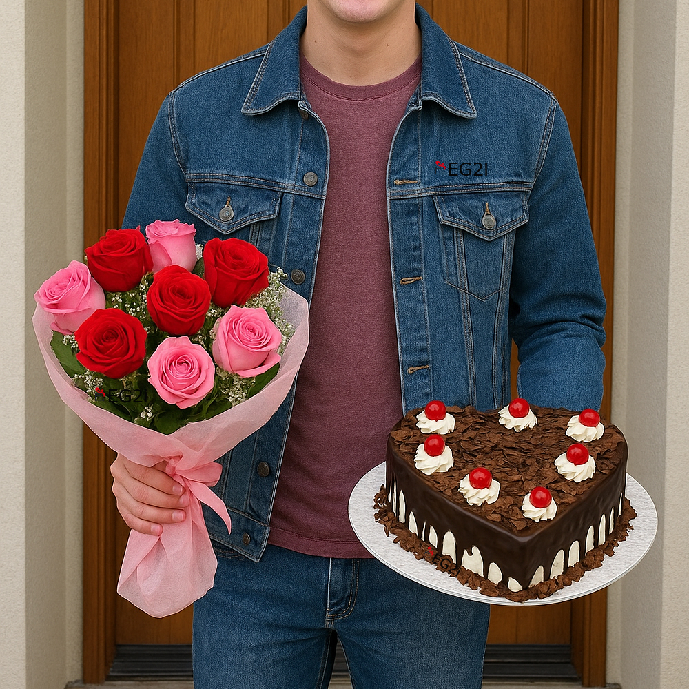 Round Bouquet of Red and Pink Roses and 500gm Heart shape Black Forest Cake.