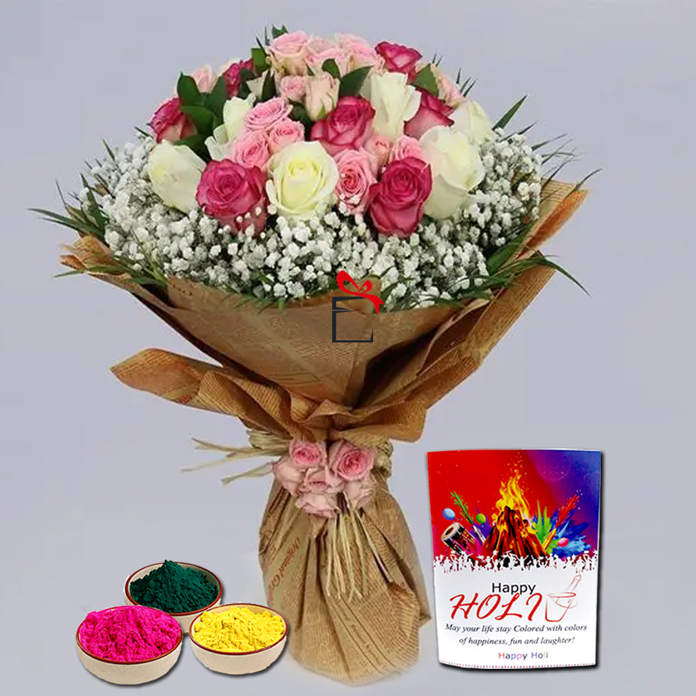 Creating a mixed roses bouquet for Holi is a wonderful idea, as it combines the vibrant colors of different rose varieties to symbolize the festive spirit of the occasion.Send This Light color Roses Boquet with Holi color to your dear one online.