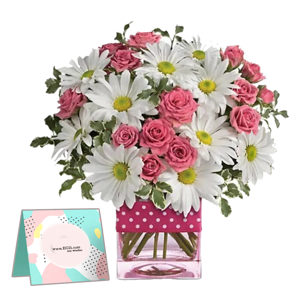 Glass Vase Arrangement of 10 White Gerbera and 20 Pink Roses.